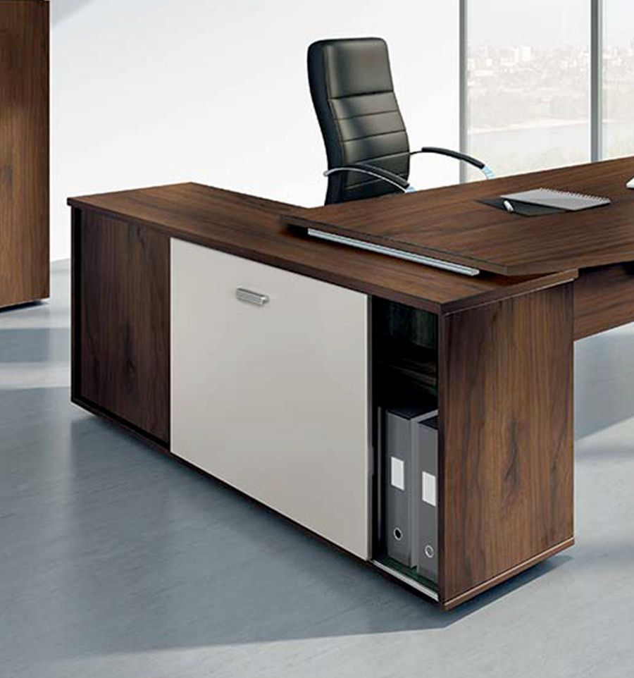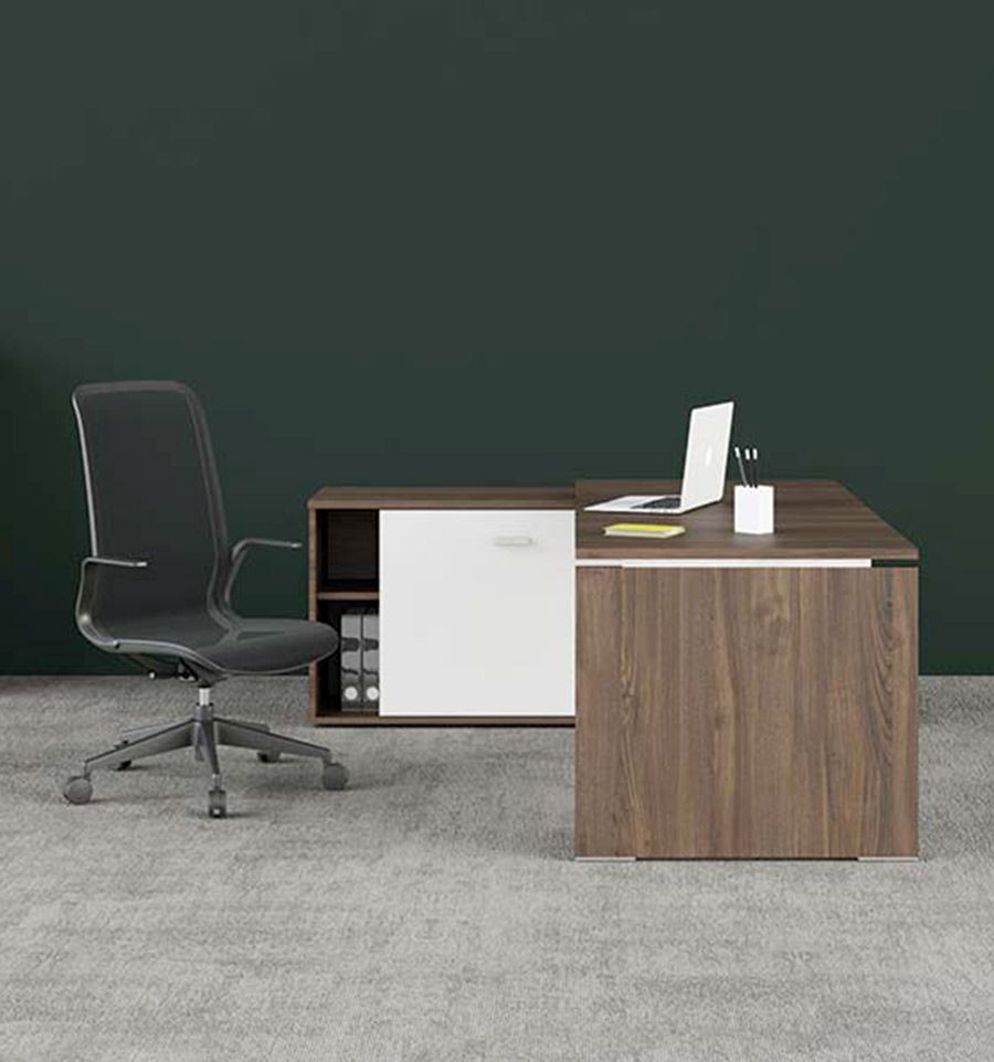 Son design contemporain est renforcé par les couleurs de décors disponibles sur le mélaminé du bureau et le meuble : chêne clair, noyer brun ou chêne café.