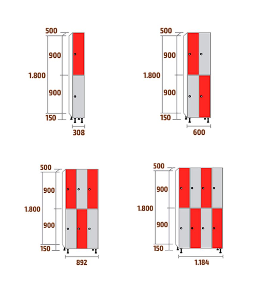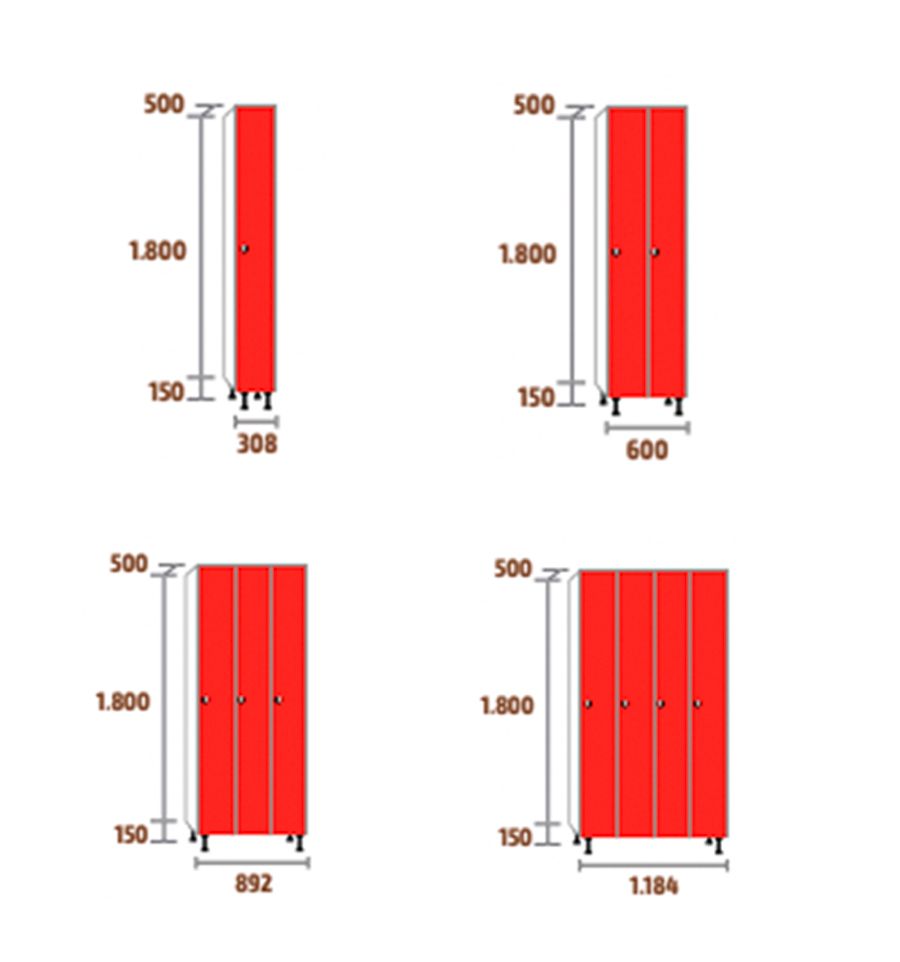 La partie arrière du vestiaire est en plaque perforée d'une épaisseur de 3 mm et est entièrement encadrée. Le vestiaire est supporté par 4 pieds en PVC réglables de 150 mm. Les modèles ont des plaques numérotées sur chaque case, ainsi l’usager peut retrouver facilement ses affaires.