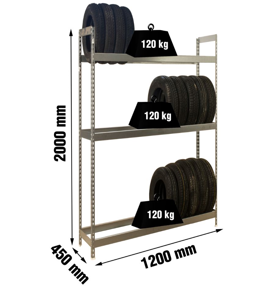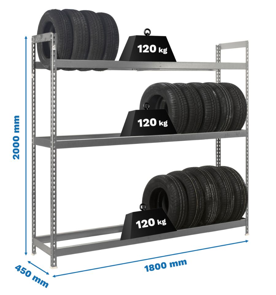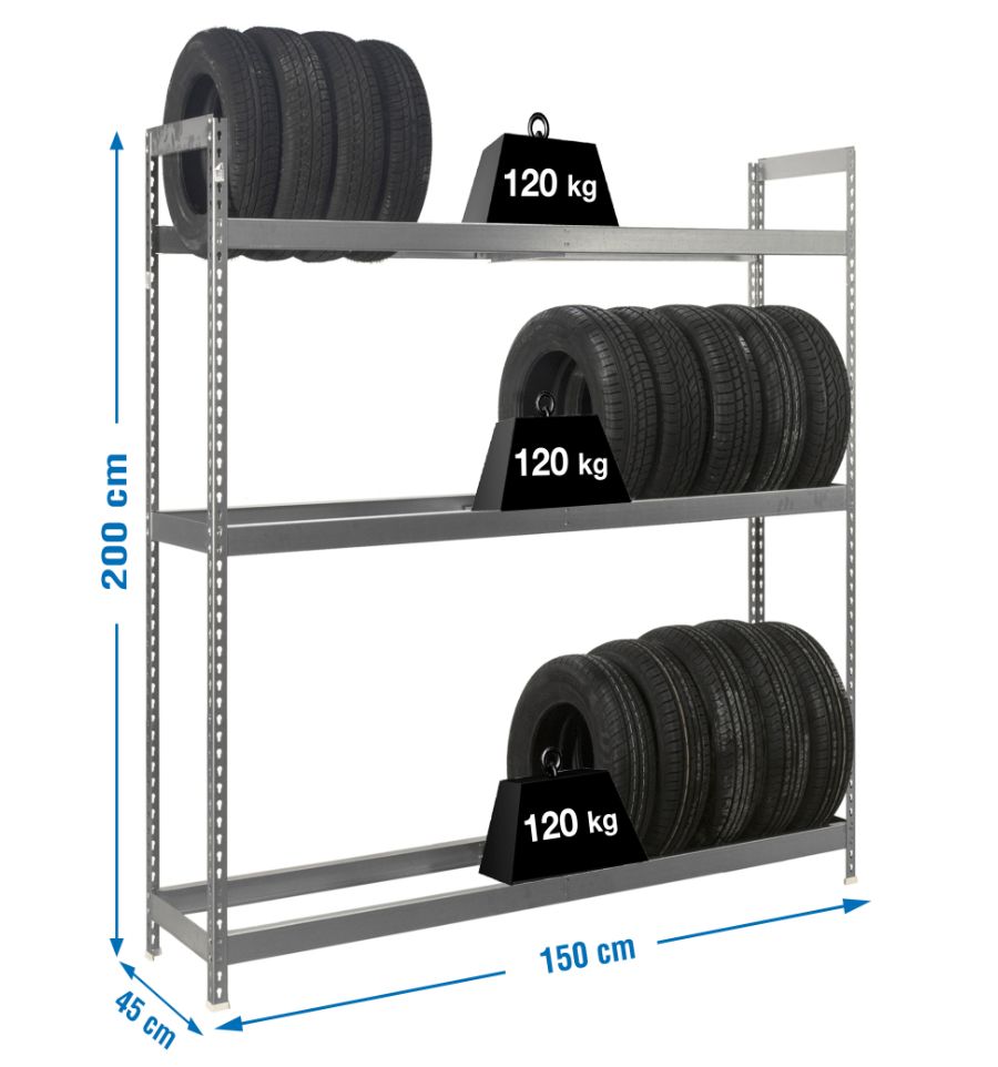 Ce rack pour pneus a trois niveaux qui peuvent supporter jusqu'à 120 kg chacun.