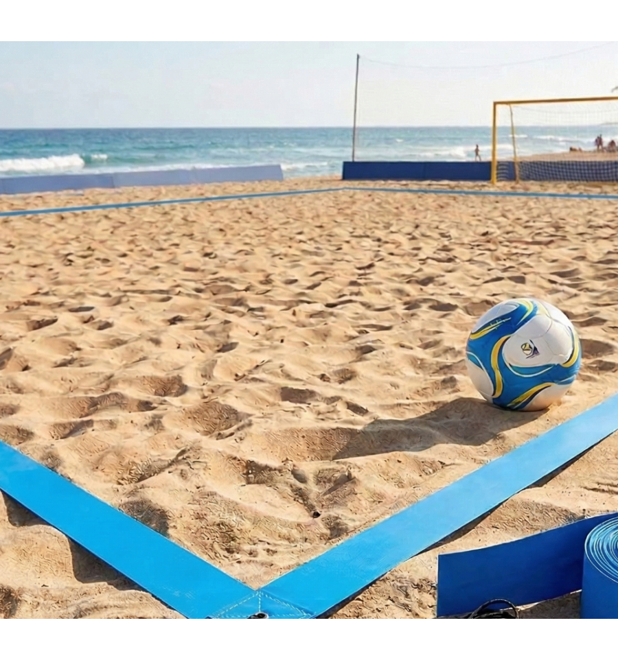 Conformément au règlement du beach soccer, la bande en PVC bleu convient pour délimiter un terrain de 37 m de long et 28 m de large. Cette ligne de délimitation est fixée dans le sable avec 6 platines réparties sur tout le périmètre afin de garantir une grande stabilité. Il faut une platine à chaque coin du terrain et une au milieu de chaque longueur à l'endroit de la ligne médiane.