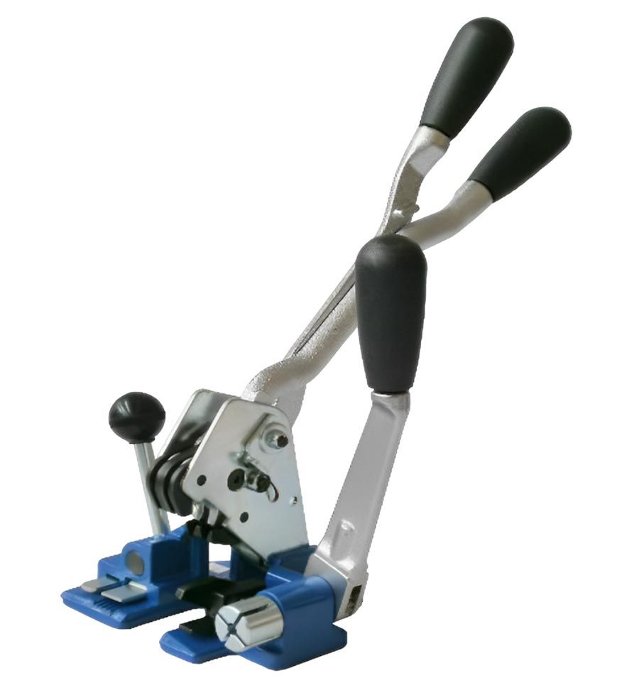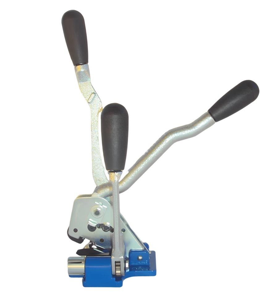 Notre combiné tendeur sertir manuel permet de réaliser les trois opérations de cerclage : tendre, sertir et couper le feuillard en PP.