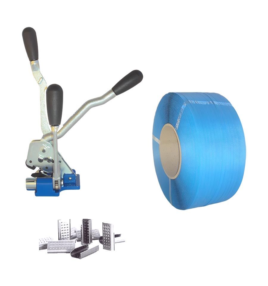 Notre appareil de cerclage maniable convient à une bobine de feuillard polypropylène de 13 ou 16 mm de largeur.
