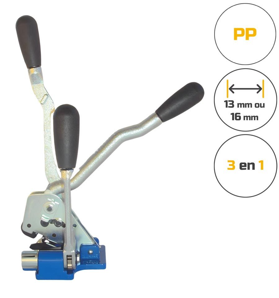 Polyvalent, il permet une forte tension du feuillard PP, tout en assurant la coupe et le sertissage de la chape métallique à la fin du cerclage. Grâce à son cabestan, la mise en tension est démultipliée, ce qui réduit l'effort nécessaire pour l'opérateur.
