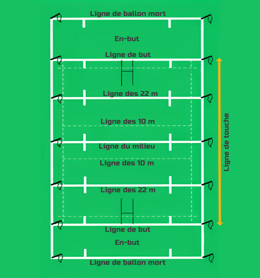 - 4 poteaux touche rugby sur les lignes des 22 mètres.