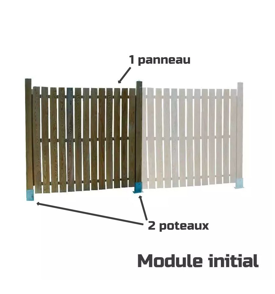 - Le module initial qui comprend 1 panneau (de 1000 mm ou 1500 mm) + 2 poteaux