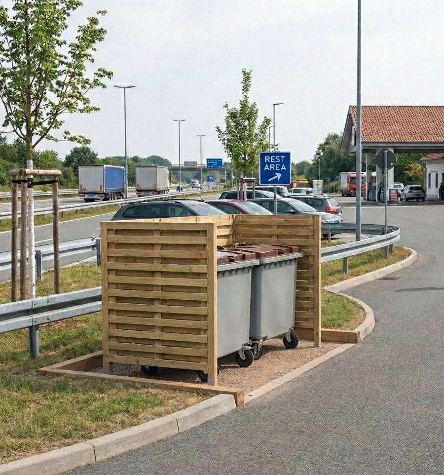 Ce cache conteneur poubelle bois fabriqué en France, optimise la gestion des déchets en définissant distinctement la zone de collecte.