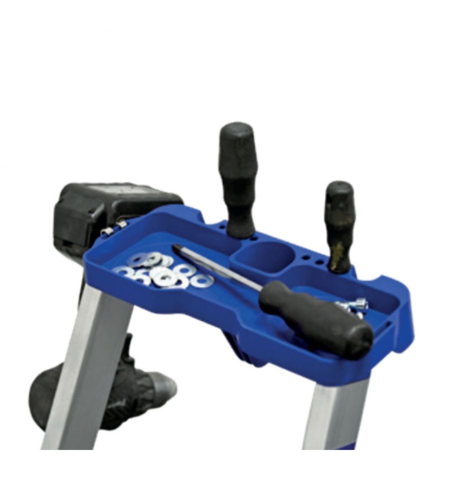 De plus, il est équipé d'une tablette porte-outils avec une réglette graduée et un crochet pouvant supporter un seau de jusqu'à 30 kg. La grande plateforme de travail antidérapante en fonte d'aluminium mesure 250 x 250 mm, offrant un espace sécurisé.