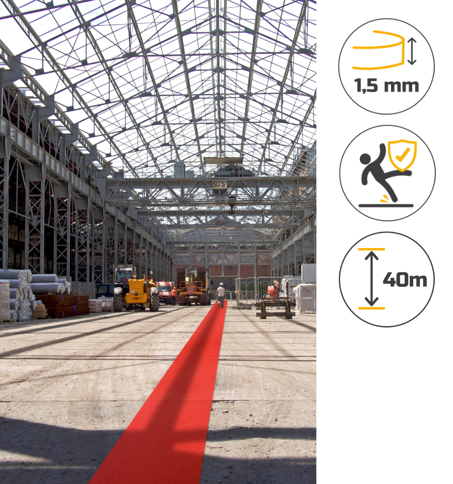 Le tapis spaghetti chantier mesure 1 mètre de large sur 40 mètres de long, offrant une couverture étendue pour délimiter efficacement les zones de passage. Avec une épaisseur de 1,5 mm, il allie légèreté et solidité, garantissant une protection optimale tout en restant facile à manipuler et à poser.