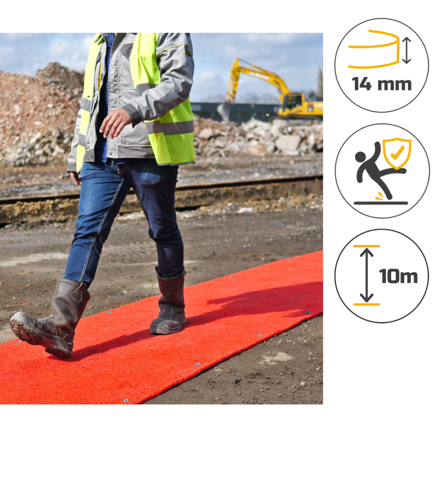 Découvrez notre modèle économique, le tapis spaghetti 1 x 40 m. Nous proposons également un tapis de chantier pour sol dur idéal pour les sols en béton ainsi qu'un tapis spaghetti 12 mm pour une meilleure visibilité.