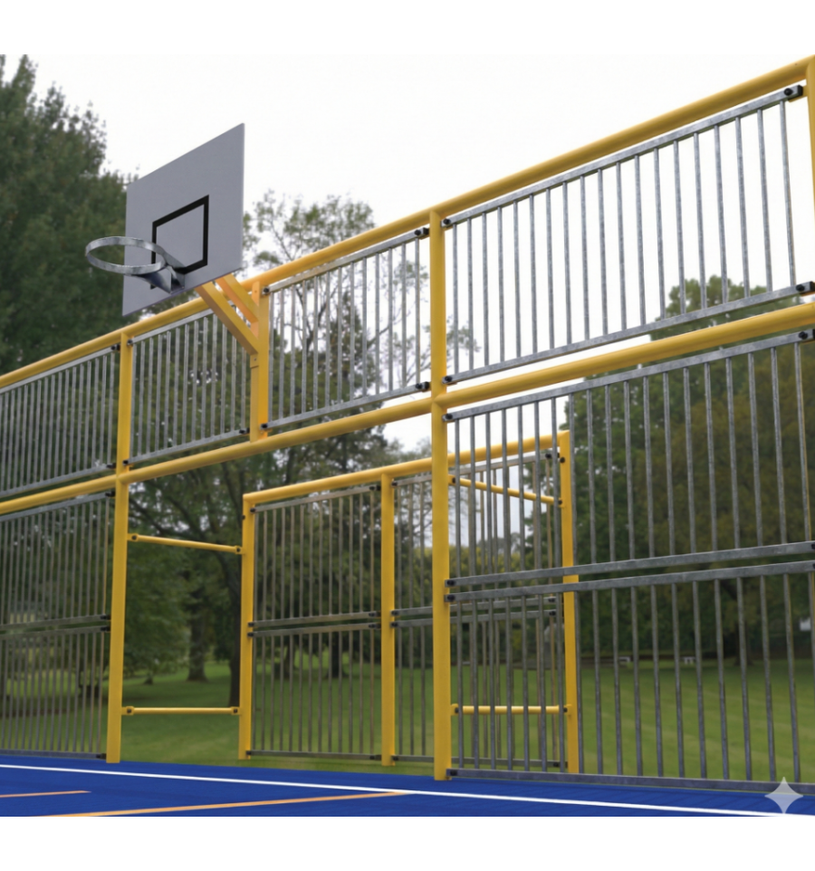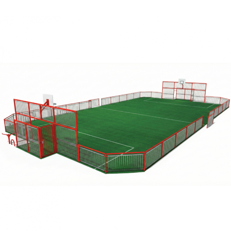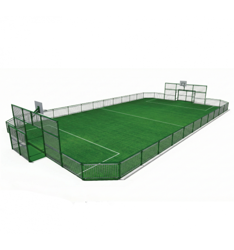 Inclus : 1 paire de buts multijeux 3x2m + basket à 2,6 ou 3,05m / Fronton autour des buts : 7,5 x 3,2m. / 2 chicanes d’entrée. Hauteur de la main courante : 1,1 m.