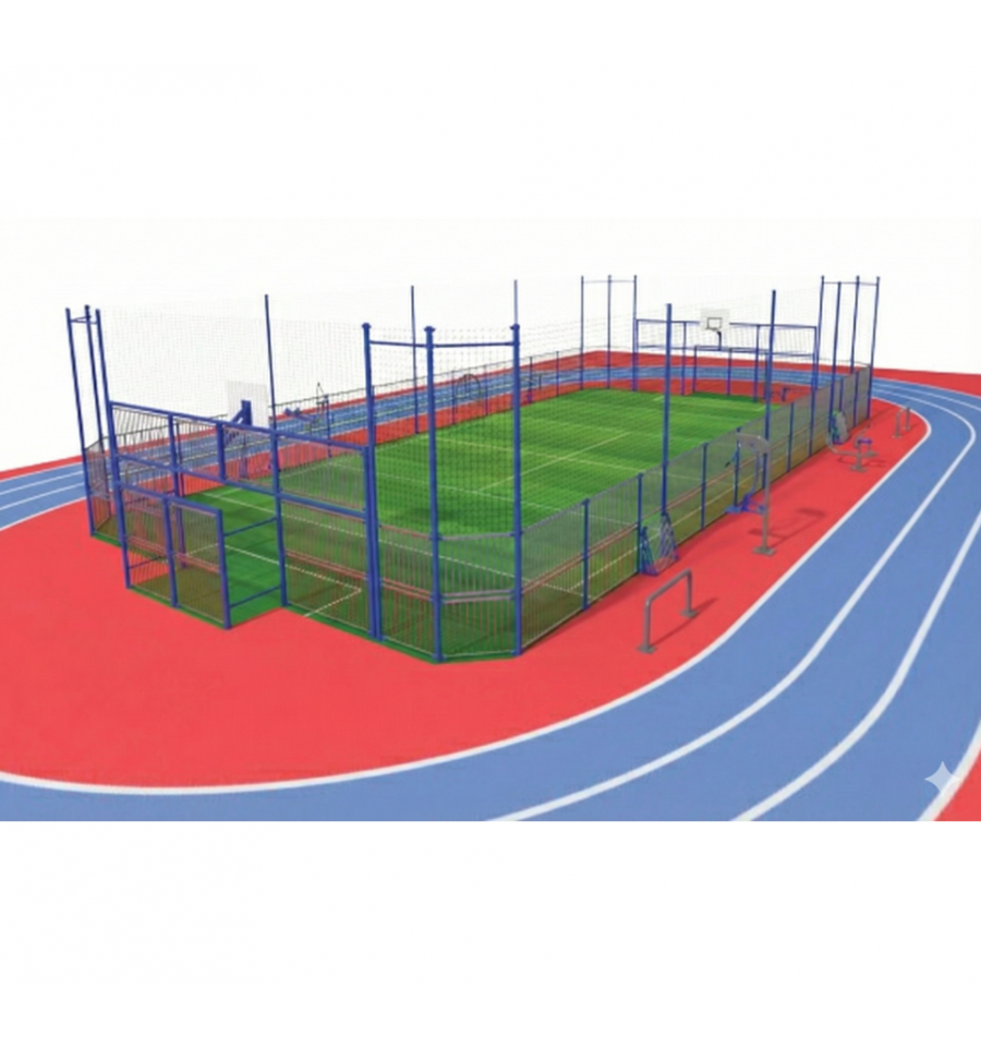 Kit complet 26 x 12 m se composant d'une paire de buts multijeux 3x2m, basket à 2,6 ou 3,05m, d'un fronton autour des buts : 7,5 x 3,2m et de deux chicanes d’entrée.