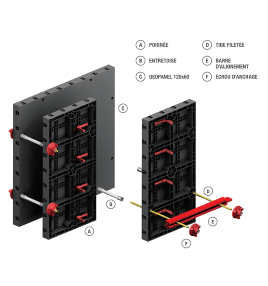 Les écarteurs sont spécifiquement conçus pour des systèmes Geopanel, un type de coffrage modulaire en plastique, léger et réutilisable. Ils s’adaptent précisément aux dimensions et à la configuration du système, garantissant ainsi un coffrage bien aligné et homogène.