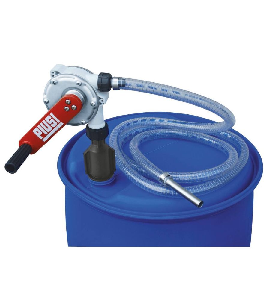 - Pompe rotative : elle est auto-amorçante et le transfert commence à partir du moment où la manivelle est actionnée en faisant des tours. Selon la vitesse d'utilisation, le flux est plus ou moins important. En moyenne, le débit est de 38 L/min. Elle est en acier inoxydable et livrée avec un tuyau de refoulement de 2,5 mètres avec un bec en inox et une canne d'aspiration.