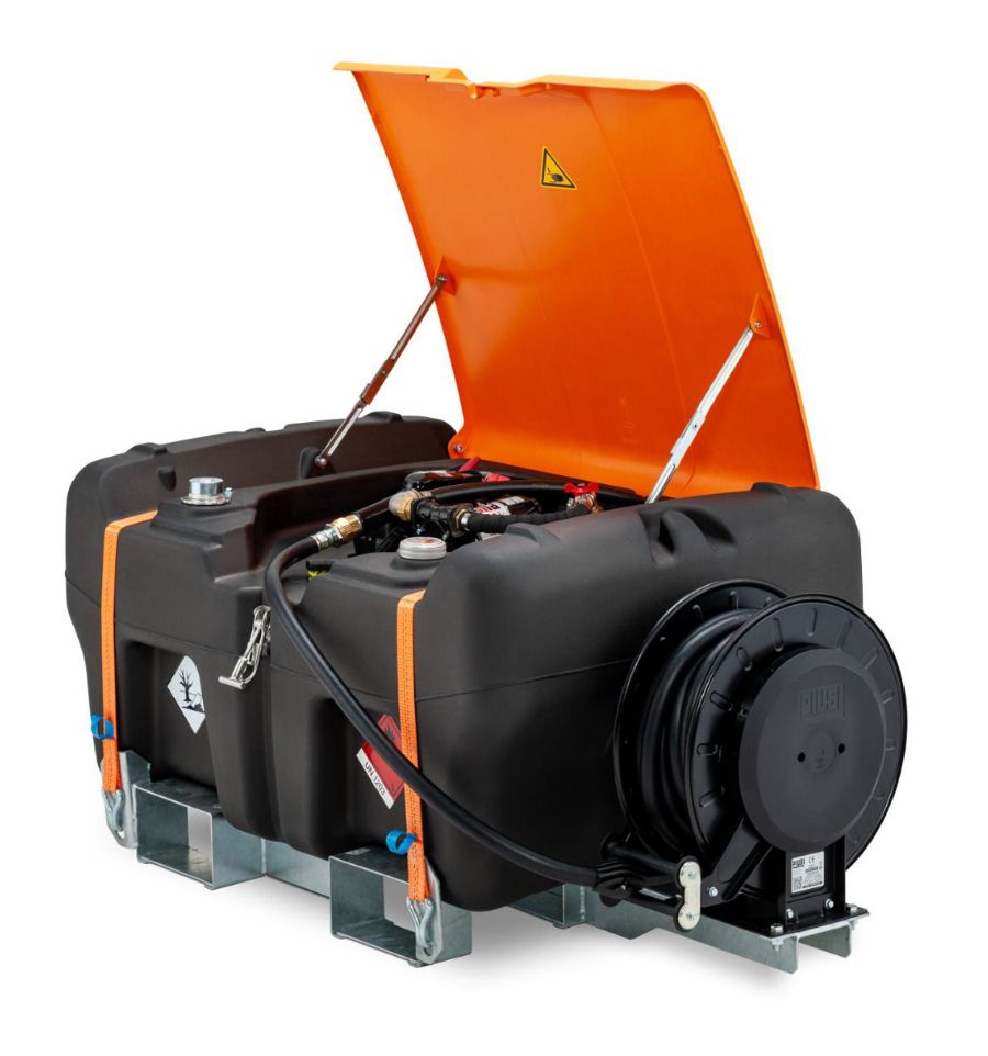 - Premium : elle comprend la cuve de base avec un châssis métallique en acier galvanisé, un passage de fourche bilatéral, un enrouleur automatique avec 10 mètres de flexible de distribution DN 19, et un câble de liaison équipotentielle de 10 mètres.