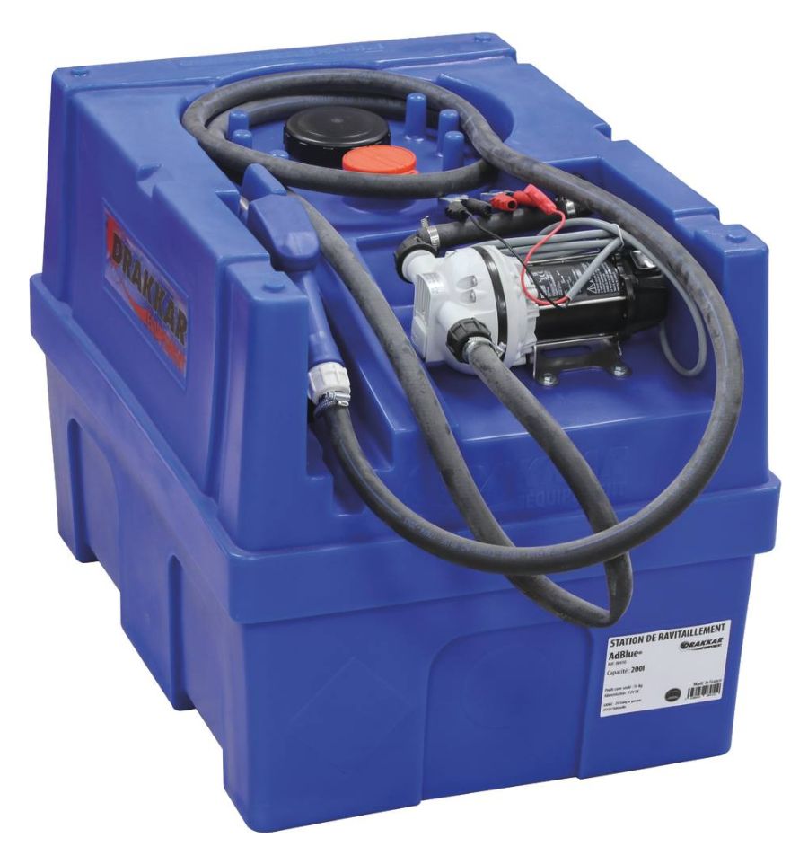 Découvrez la cuve de ravitaillement pour AdBlue avec une capacité de 200 litres. Elle possède une pompe intégrée de 12 volts avec un débit de 36 litres par minute et un pistolet de distribution automatique.