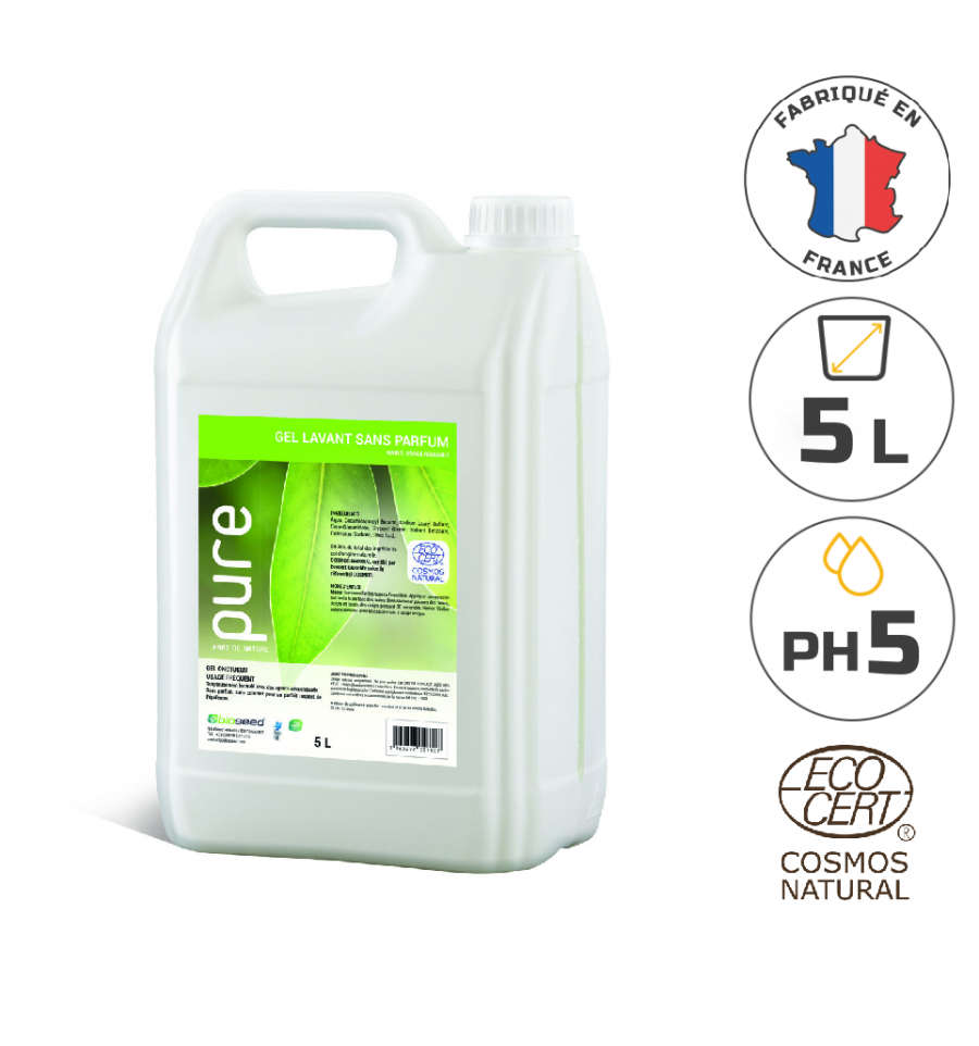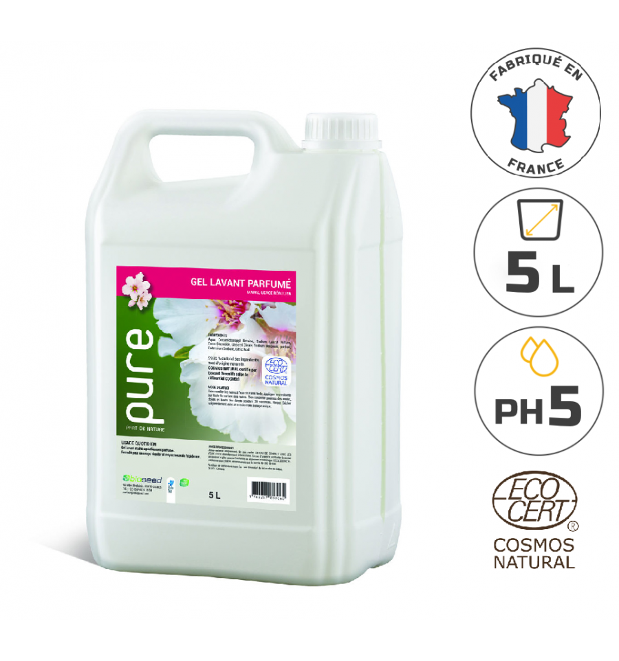 Notre savon liquide 5 litres ecocert est disponible sans parfum ou parfumé aux fleurs blanches. Grâce à un pH de 5, notre savon liquide 5l est respectueux de l'épiderme.