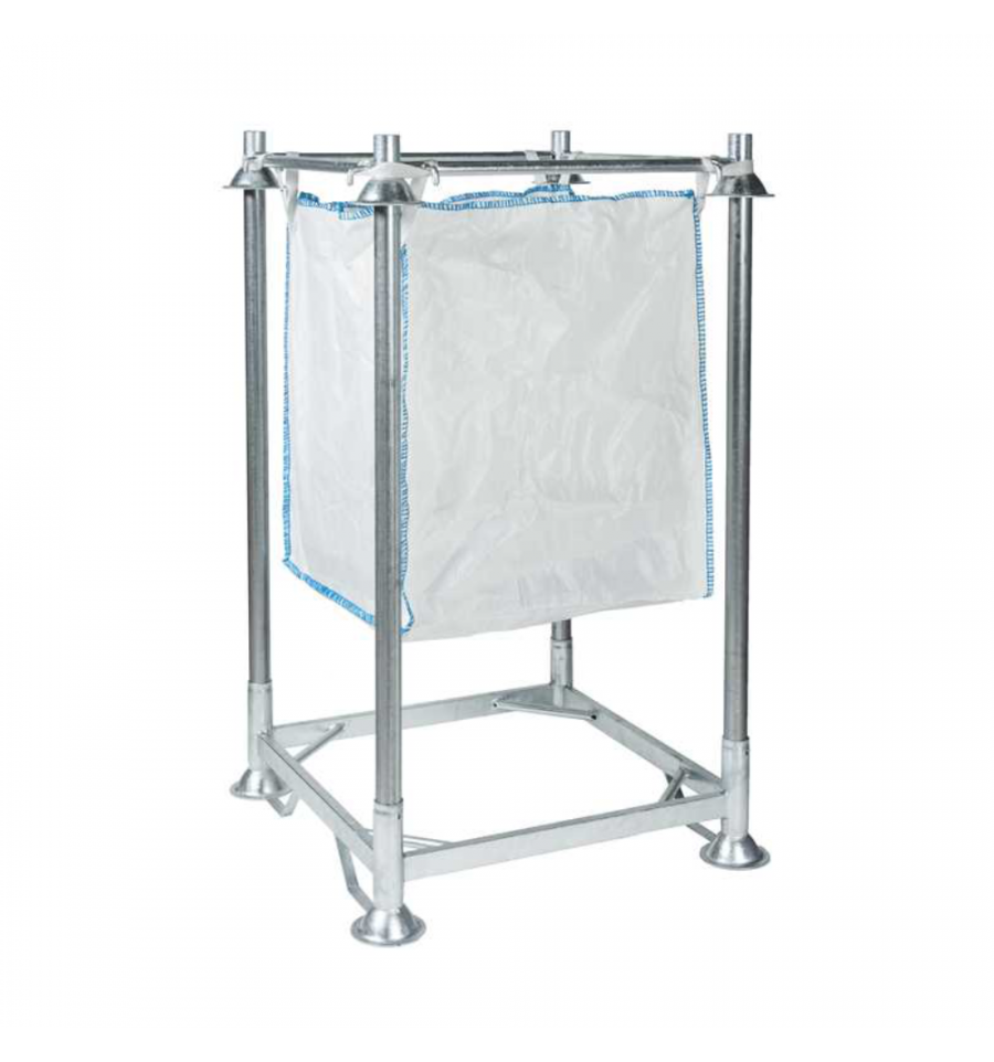 Ce porte big bag est composé de trois éléments : une base palette offrant une excellente stabilité, quatre tubes dont la longueur varie selon le modèle (1050, 1680 ou 2100 mm), et un cadre supérieur destiné à maintenir le big bag en place.