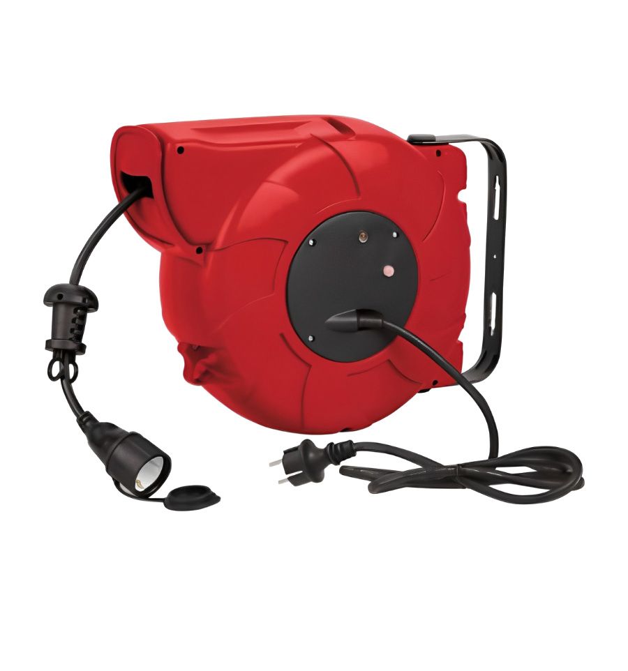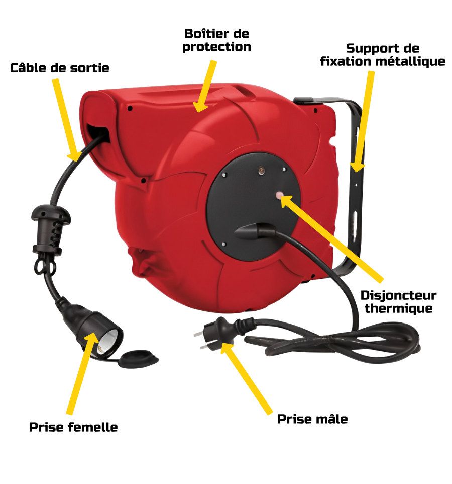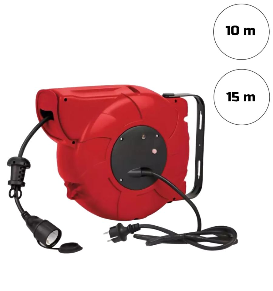 Disponible en 10 ou 15 mètres, il est pivotable à 180°. Il se fixe sur une paroi ou un mur d'outils pour brancher n'importe quel appareil éloigné d'une prise secteur.