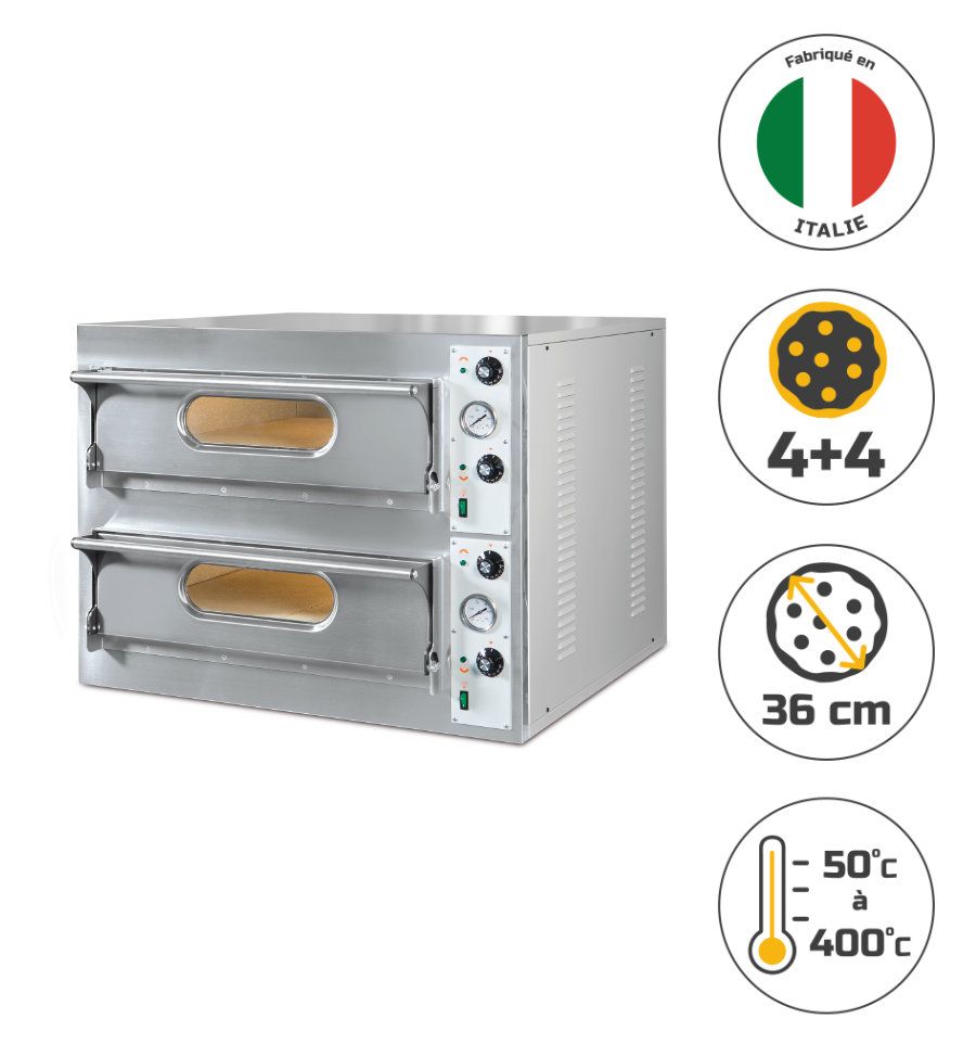Notre four à pizza 220v peut cuire huit pizzas de 36 cm de diamètre en même temps grâce à ses deux chambres de cuissons.