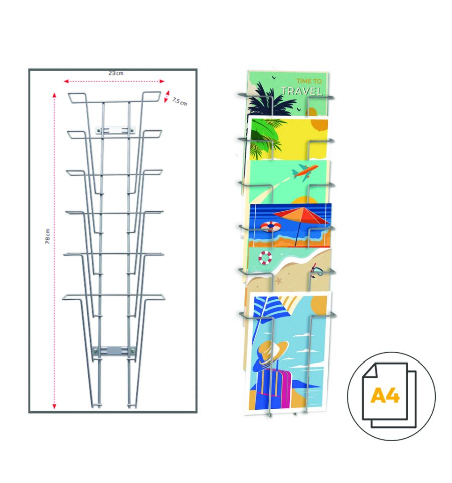 Ce présentoir possède une dimension de 78 cm de hauteur de 23 cm de large qui lui permet de se positionner dans tout type d'endroits, il est idéal pour présenter des documents à l'accueil, dans votre point de vente ou dans des salles d'attentes ou des salles d'expositions.
