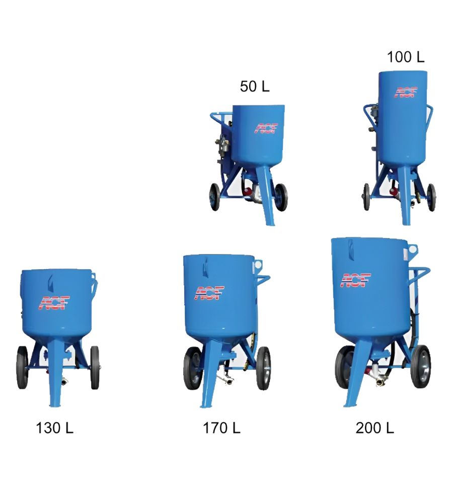 La sableuse à pression est disponible en plusieurs capacités de réservoir : 50 L, 100L, 130 L, 170 L et 200 L.