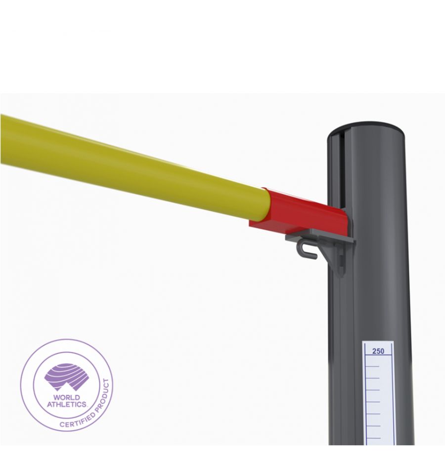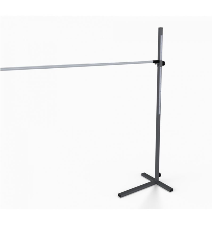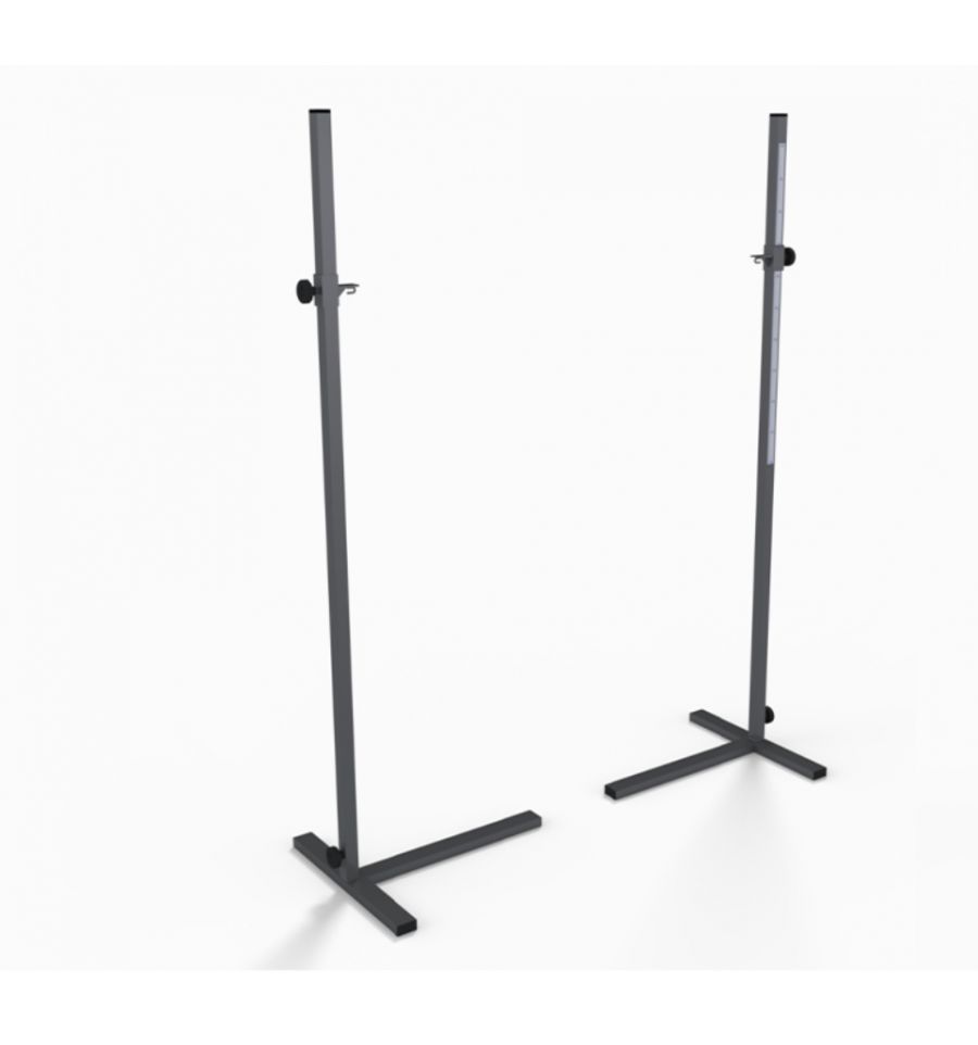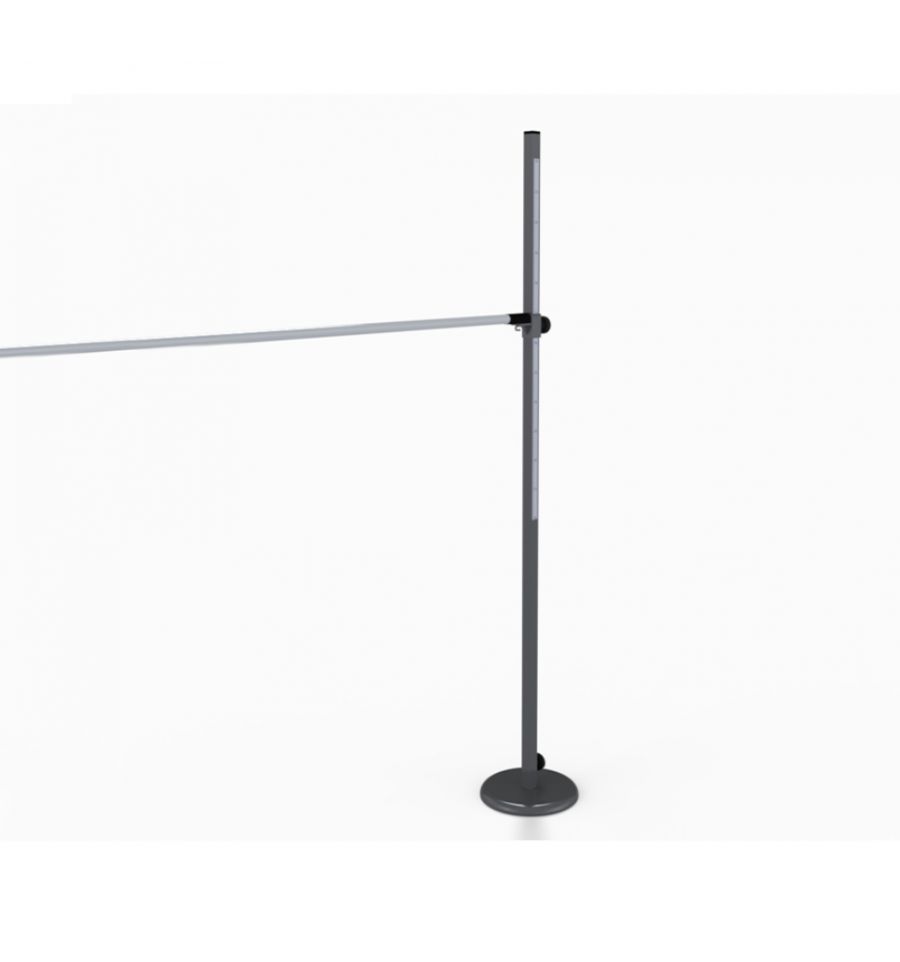 Ce modèle est en acier galvanisé avec un pied de 60 x 30 mm, sa hauteur est réglable de 1 m à 2 m. De plus, il possède un ruban métré adhésif à partir de 1 m de hauteur. La barre de support est donc ajustable jusqu'à 2 m de hauteur et les taquets présents permettent de poser la barre de saut.