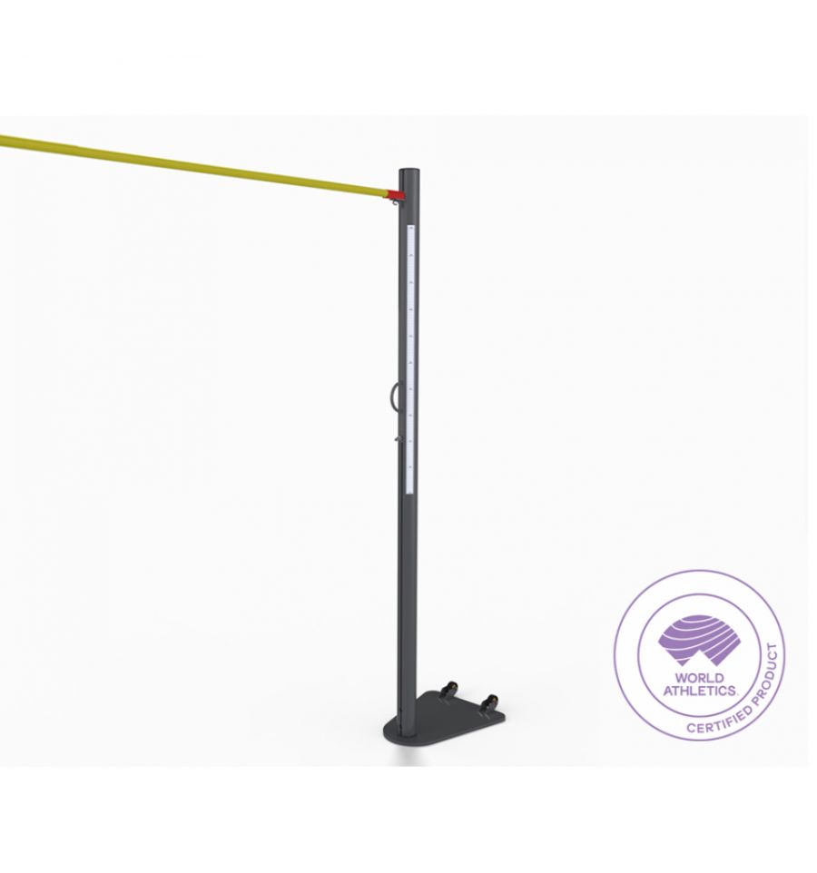 Un ruban adhésif métré est aussi présent sur ce modèle. Les taquets permettent d'y mettre la barre de saut. La stabilité de ces poteaux est accrue grâce à la base de 20 kg par poteau.