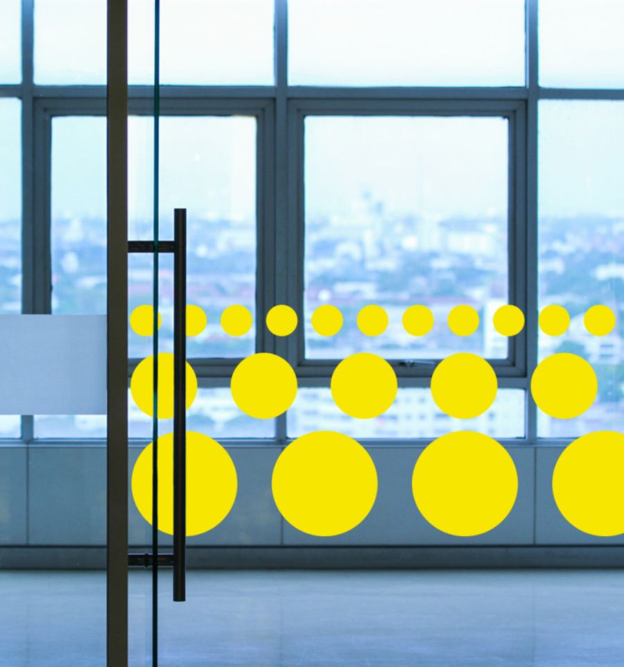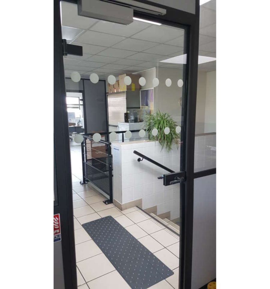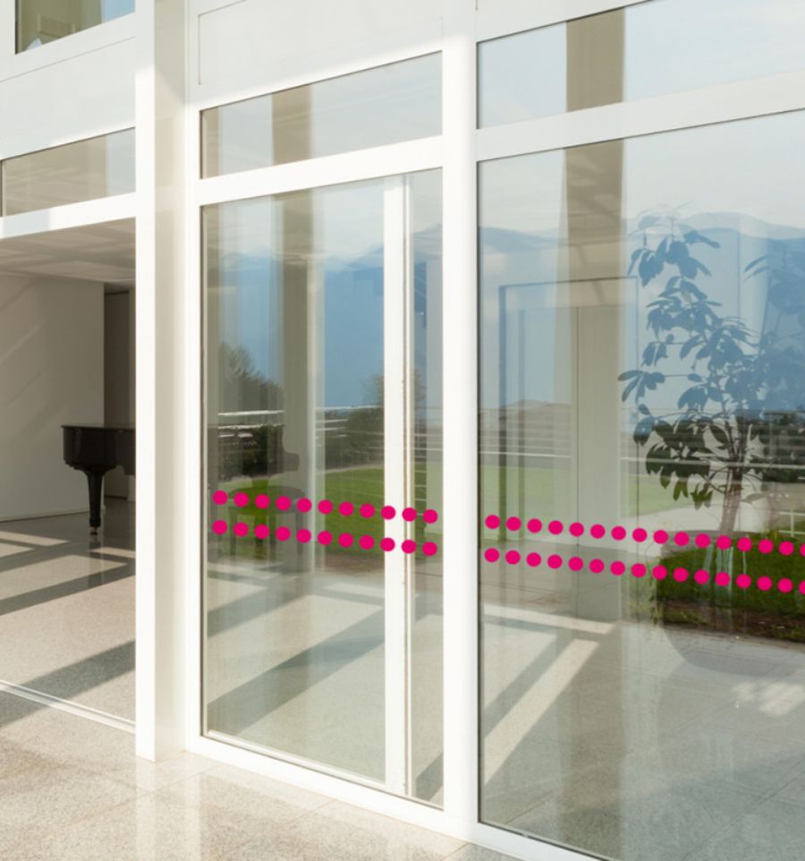 Si vous possédez des surfaces vitrées à signaler, optez pour une bande de signalisation formée de ronds. Une fois positionnés, ces ronds de couleurs permettent de créer un contraste visuel, la vitre devient alors visible ce qui limite le risque d'accidents.
