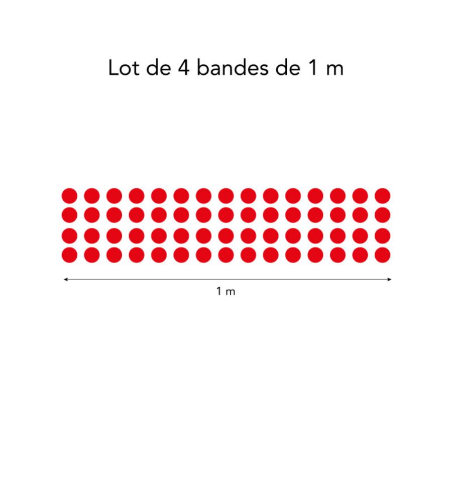 Bande de signalisation pour surface vitrée de ronds adhésifs. Bande d'une longueur de 1 m. Pose en vitrophanie, les autocollants sont posés du côté intérieur de la vitre.