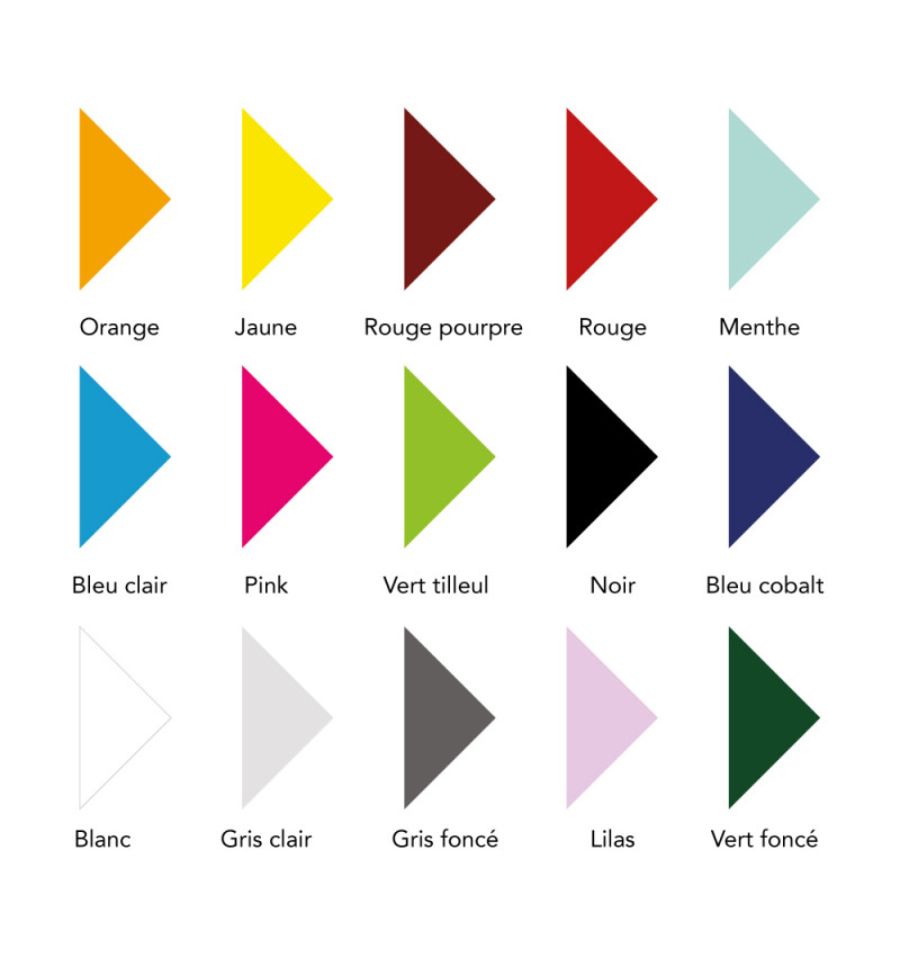 Existe dans 15 coloris différents, avec 2 aspects d'adhésif au choix (brillant ou mat) et dans 3 hauteurs différentes (5 cm, 10 cm ou 18 cm).