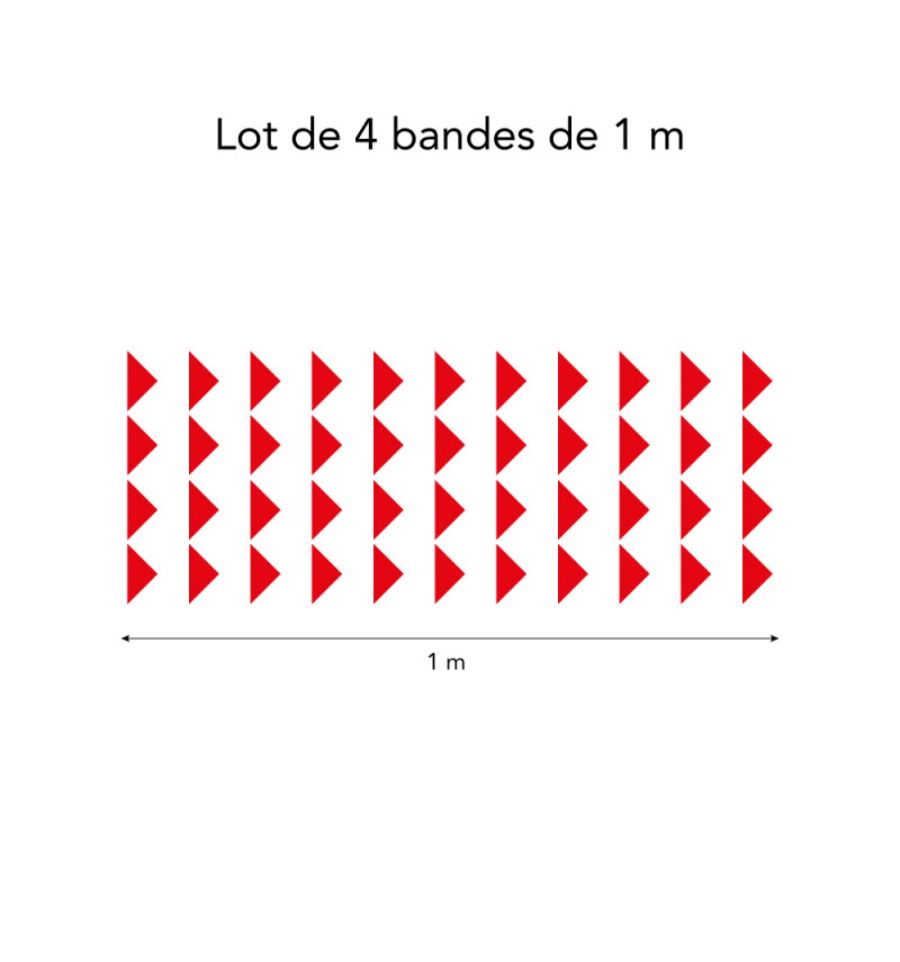 Nos bandes de triangles sont formées d'adhésif en vitrophanie. Ils sont destinés à être posés sur une surface vitrée côté intérieur pour être vu de l'extérieur.