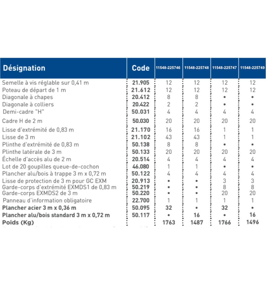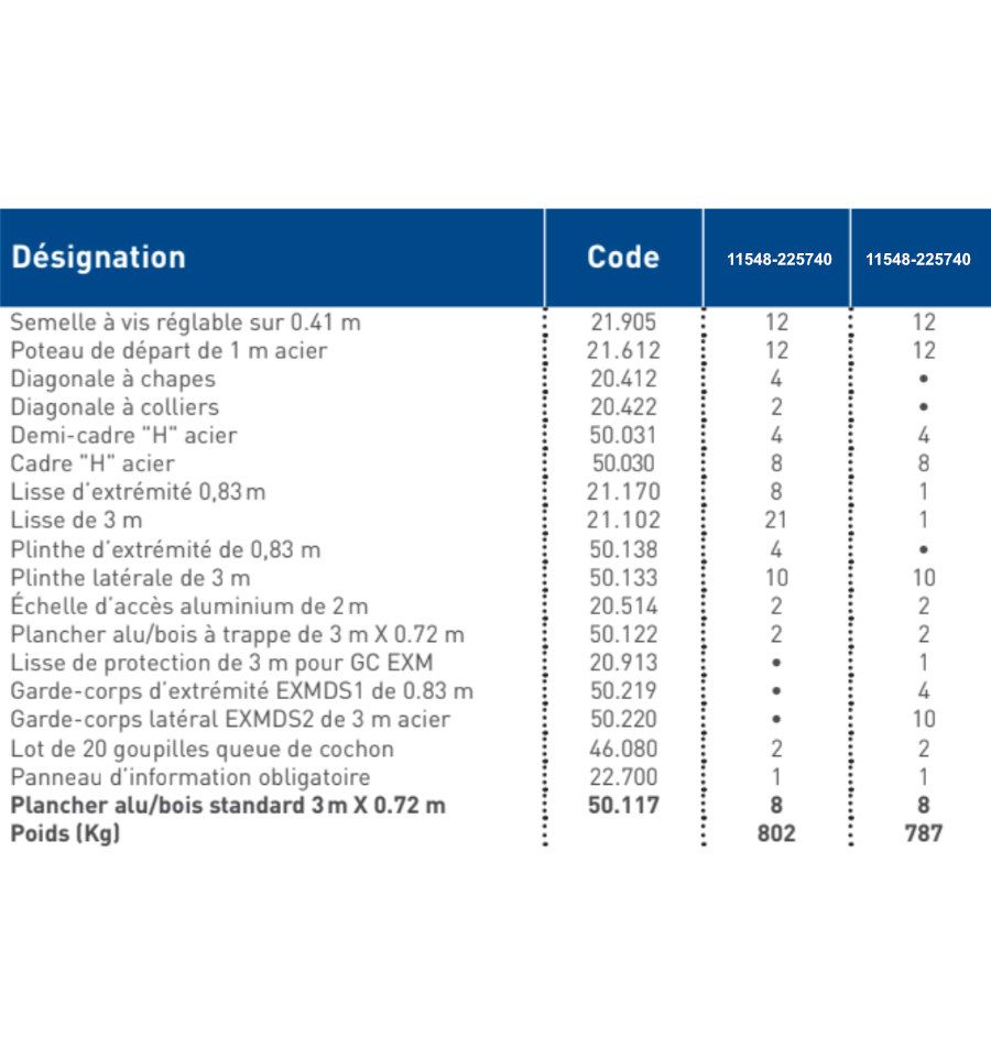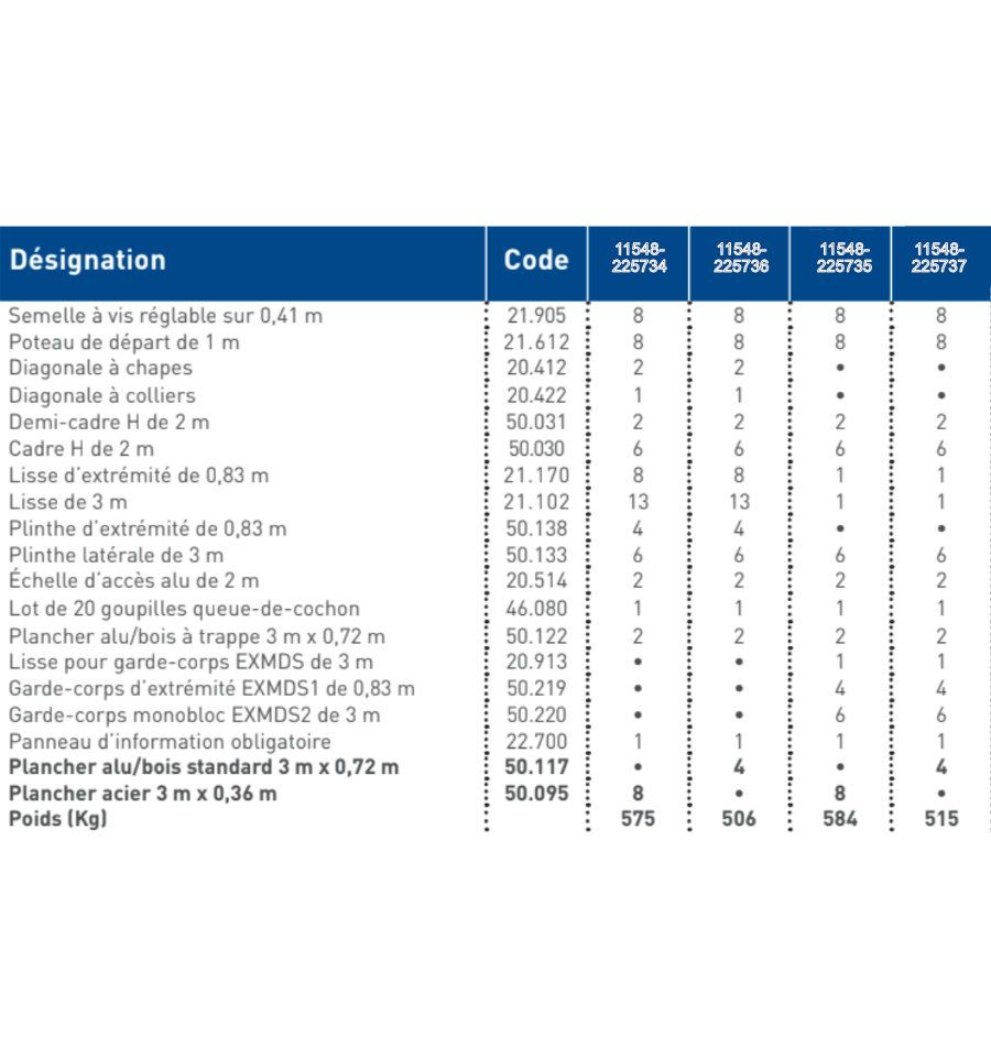 Caractéristiques techniques de l'echafaudage fixe