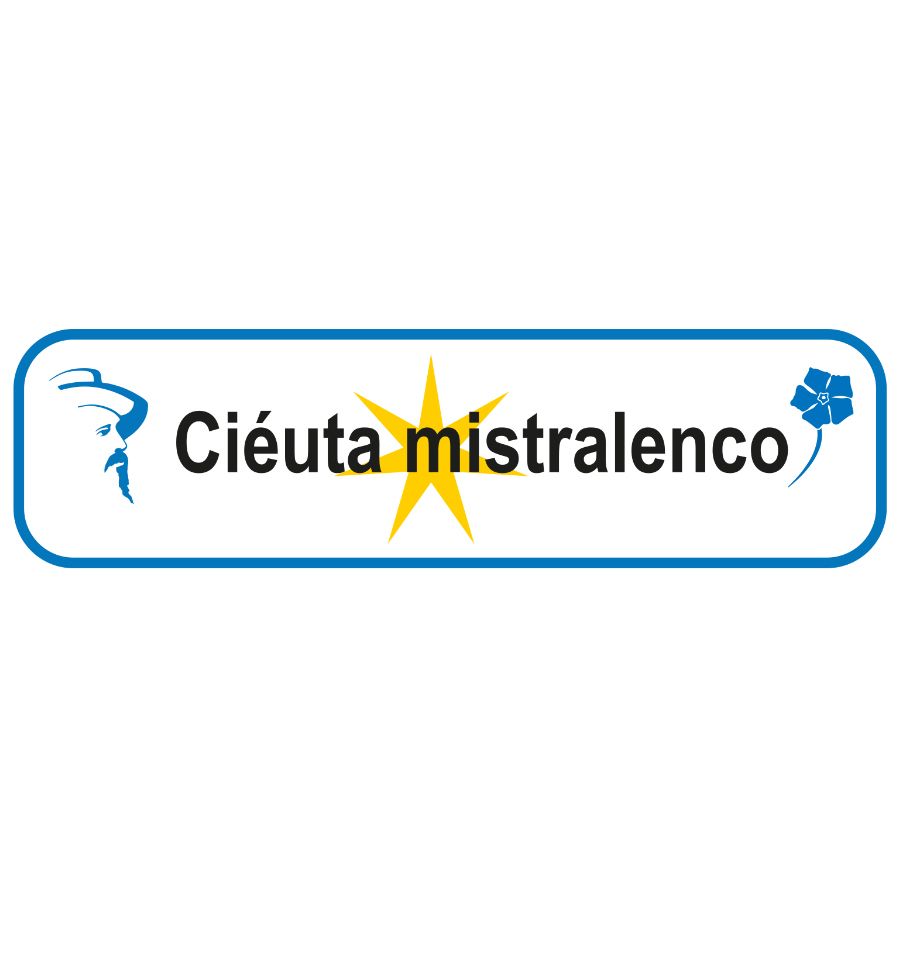 Le panneau Ciéuta Mistralenco est conçu pour symboliser l'engagement des communes labellisées. Il se compose d'un texte central "Ciéuta Mistralenco", inscrit entre le portrait de Frédéric Mistral et une pervenche, avec pour fond une étoile à 7 branches. Sous l'inscription principale figure le slogan "Cité qui œuvre pour la culture provençale" ou bien "Cité qui œuvre pour la culture des pays d'Oc".