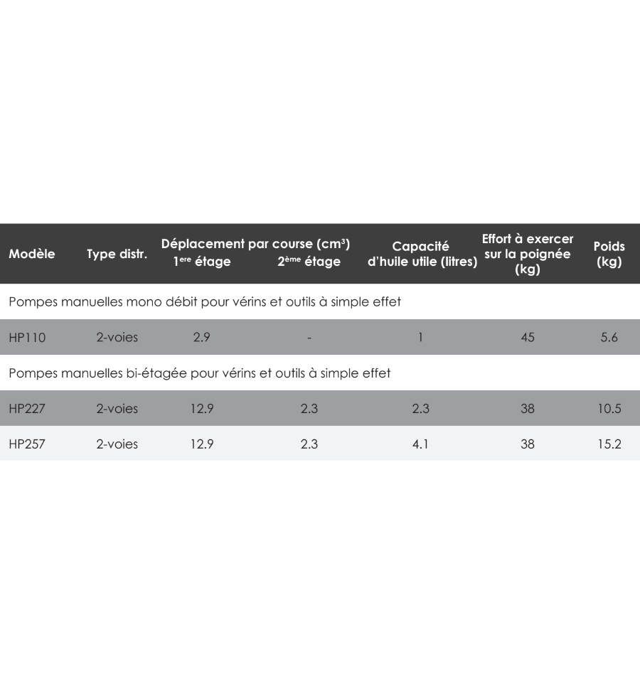 Cette pompe en aluminium est conçue pour une utilisation sur des vérins et outils à simple effet. Vous pouvez opter pour les modèles en aluminium HP232D et HP252D à 4 voies de distribution pour des vérins à double effet, disponibles sur devis.