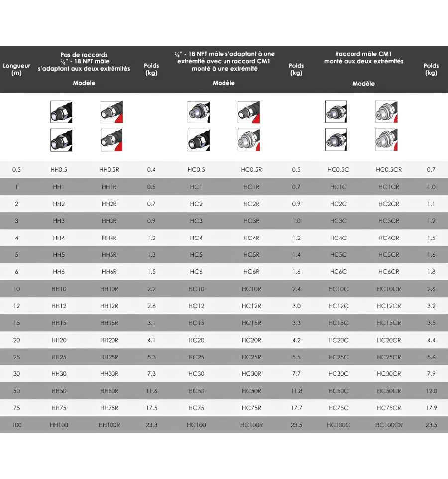 Vous trouverez ci-dessous le tableau détaillant les caractéristiques techniques de nos flexibles.