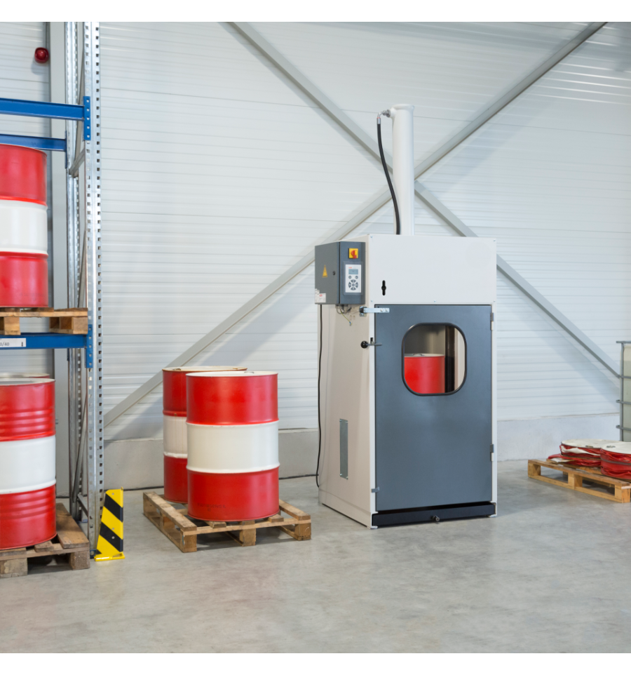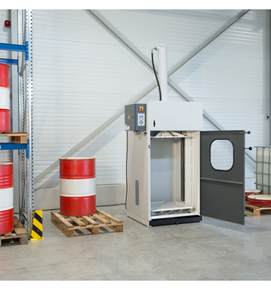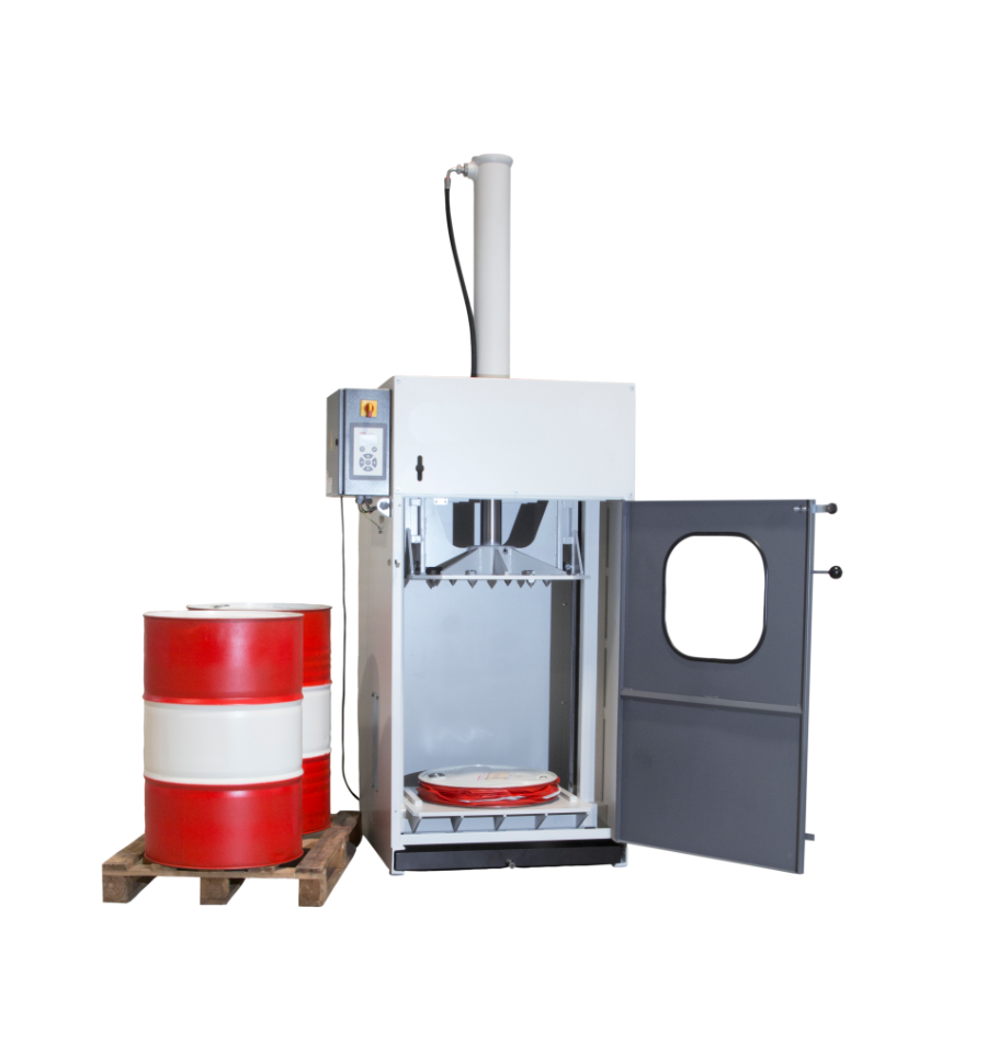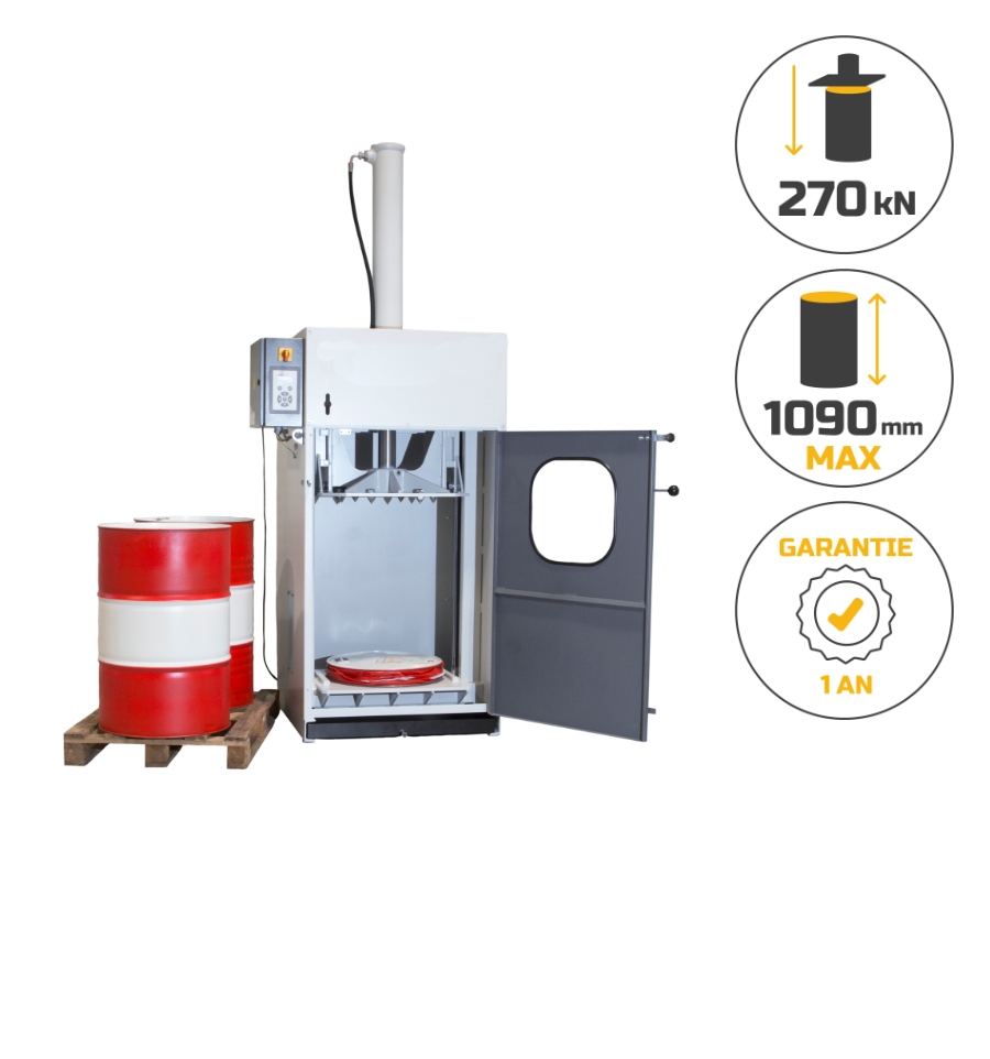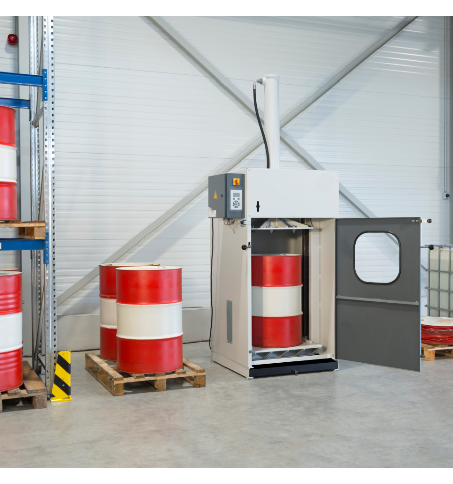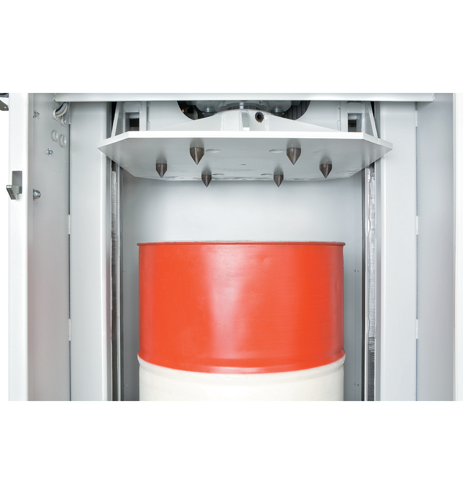 Grâce à sa large ouverture de chargement de 618 x 1092 mm, cette presse peut accueillir même les fûts de grandes dimensions d'une hauteur allant jusqu'à 1090 mm. En général, les fûts utilisés en industrie font une taille maximum de 950 mm de haut.