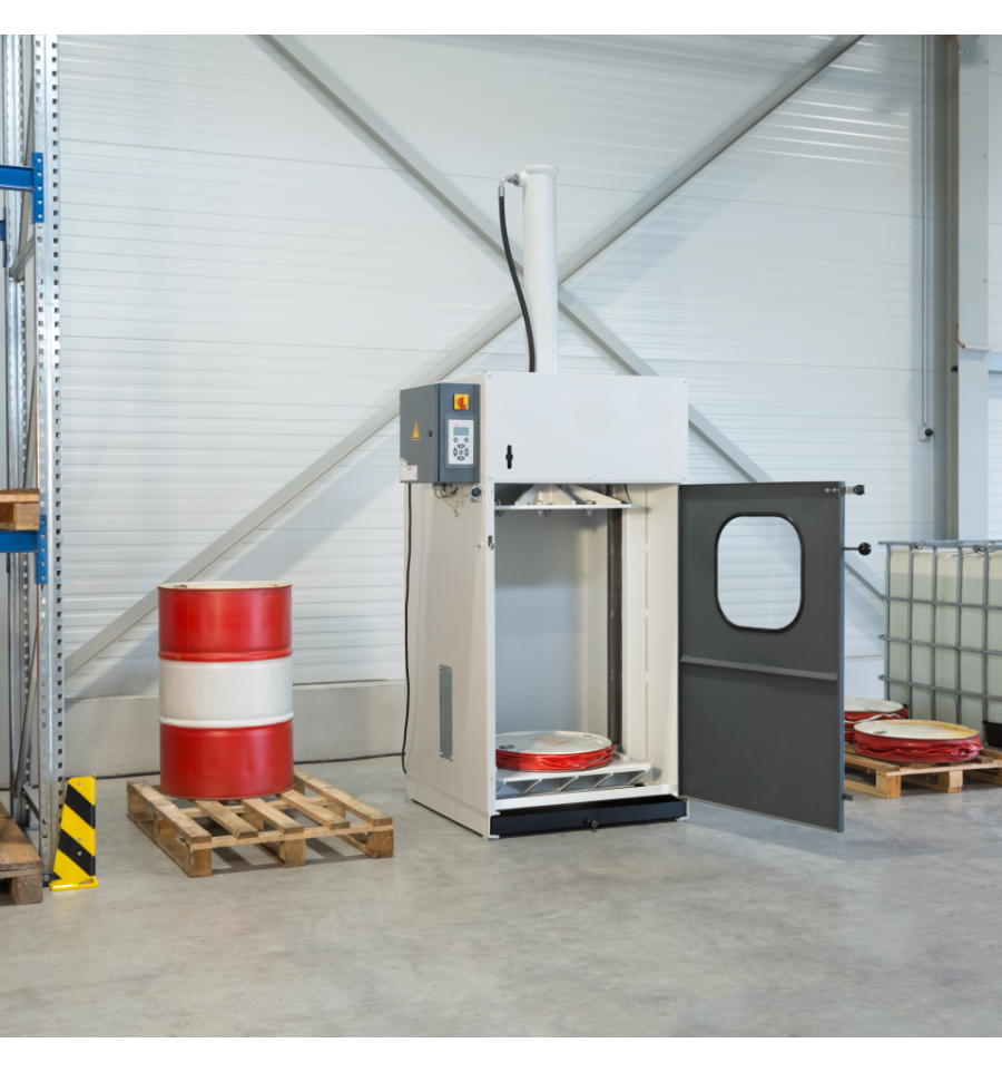 Avec une force de compactage de 270 kN, cette presse à fût est capable de compacter efficacement aussi bien des fûts en tôle légère que des fûts renforcés.