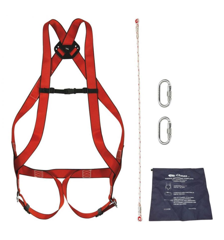 Chaque kit comprend : un harnais réglable (avec 1 ou 2 points d’attache selon le modèle), une longe antichute, deux mousquetons (à vis ou automatique selon le modèle) et un sac de rangement.