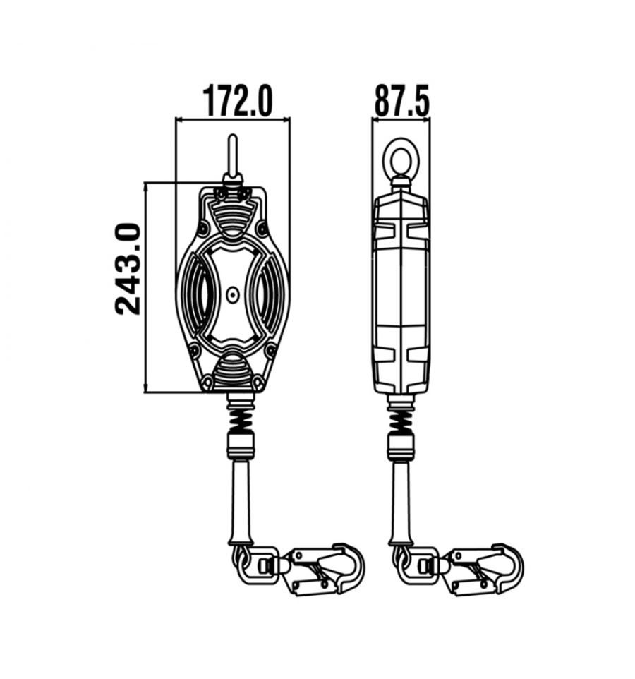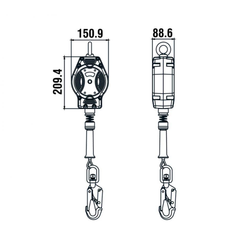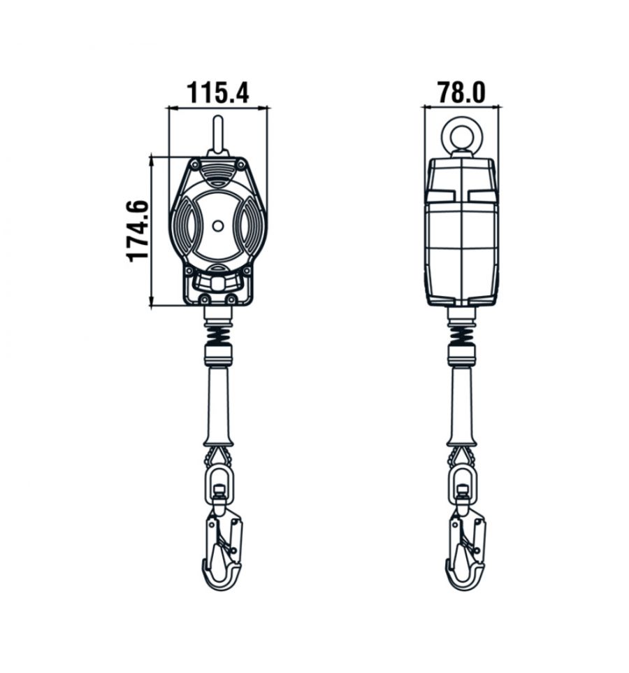 Équipé d'un carter polymère, il intègre une anse de portage, un câble en acier galvanisé, un connecteur avec indicateur de chute, une poignée de préhensions, un système de frein et un absorbeur d'énergie externe. Il possède également un émerillon et un mousqueton pour se connecter aux points d'ancrage.