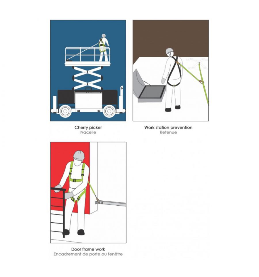 Une fois le harnais bien en place, on s’assure que le ou les points d’ancrage sont libres d’accès et prêts à être connectés à une longe antichute de maintien, une longe de maintien avec absorbeur ou à un système de retenue adapté.