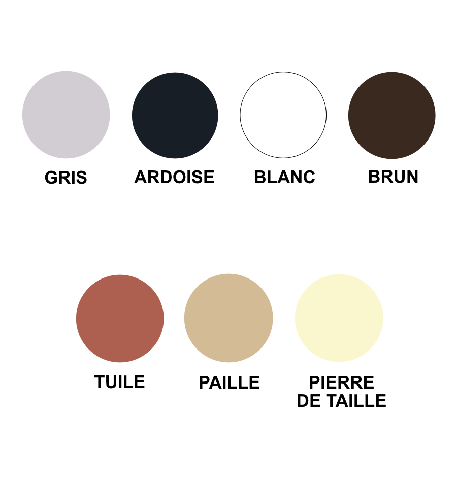 - Coloris : ardoise, blanc, brun, gris, paille, pierre de taille, tuile