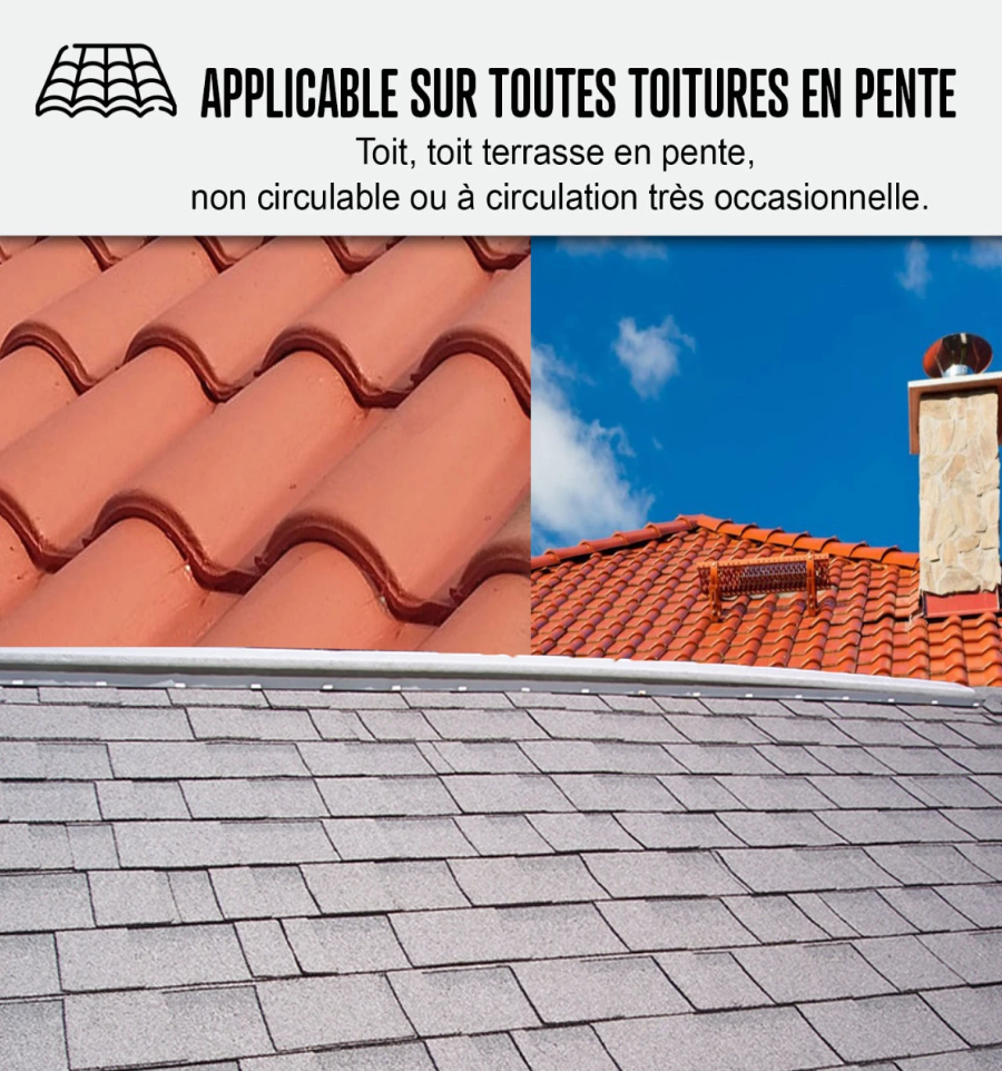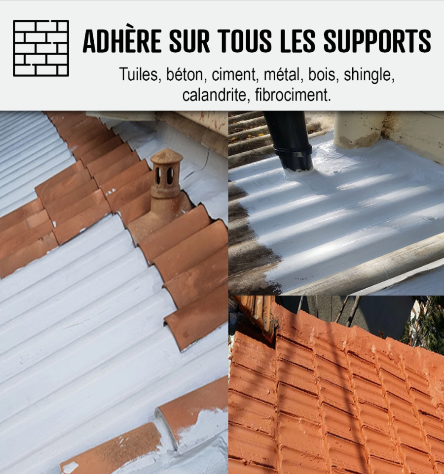La peinture d’étanchéité s’adapte à de multiples matériaux poreux ou fissurés qui ne présentent pas de stagnation d’eau : tuile, tuile migeon, polyester, aluminium, béton, fibre ciment, shingle, everite, bois, zinc, acier galvanisé, calandre, tôle… (excepté les surfaces déjà peintes ou déjà couvertes d’une résine).