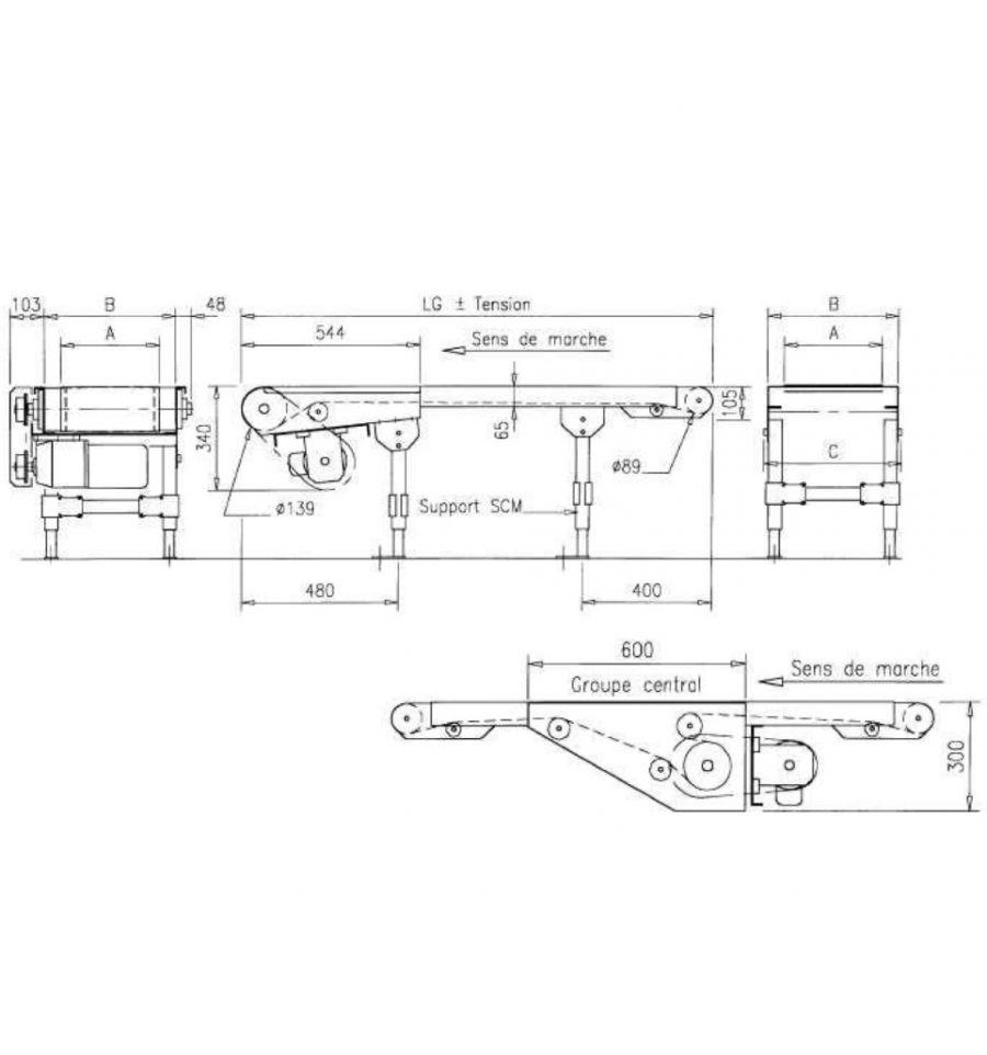 Le groupe de commande est équipé d'un tambour de ø139 bitronconique et caoutchouté et d'un motoréducteur triphasé 380V d'une vitesse de 15m/min monté à l'avant du convoyeur, sur le côté.