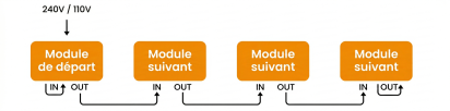 Seul le module de départ doit être branché avec un câble adaptateur, les unités suivantes seront fournies d'alimentation grâce aux câbles intermodule.