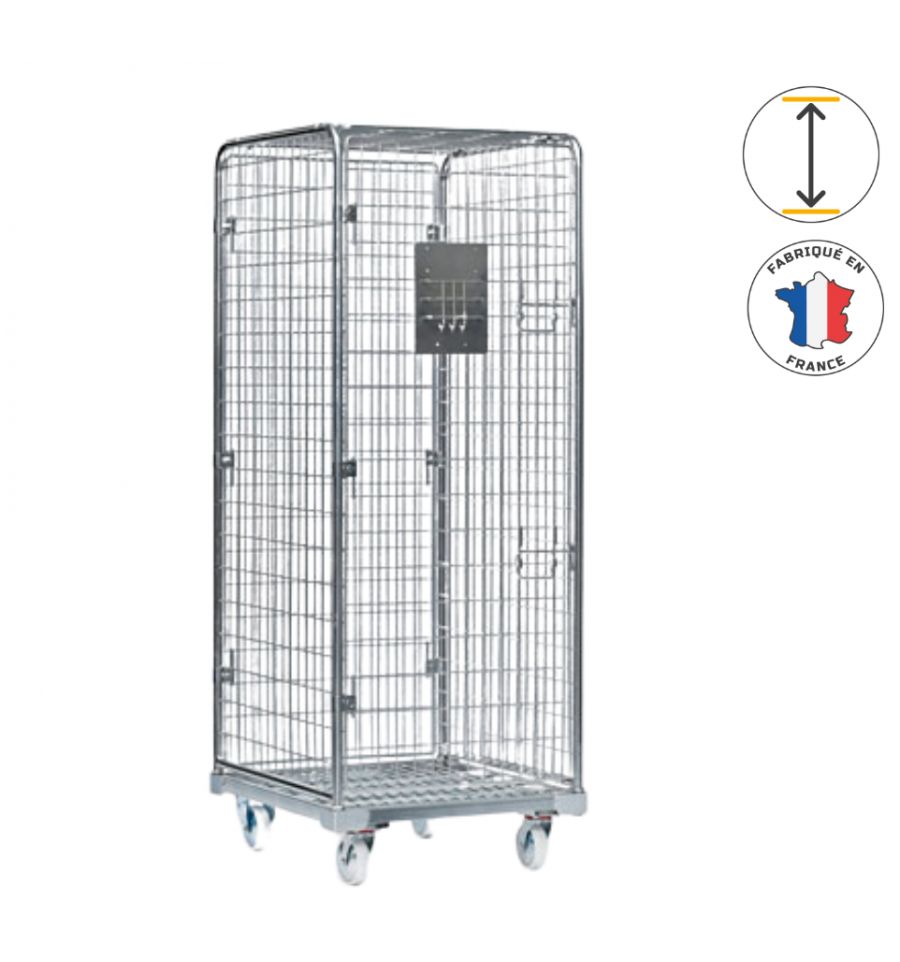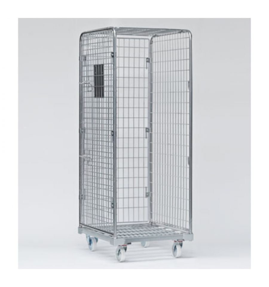 Ce chariot de manutention sécurisé est doté de mailles très serrées pour éviter la perte d'objet. Il comprend 4 côtés dont 1 porte refermable par un cadenas (non fourni) et un toit.