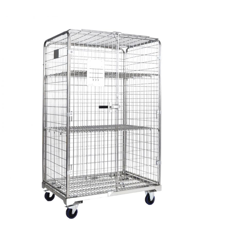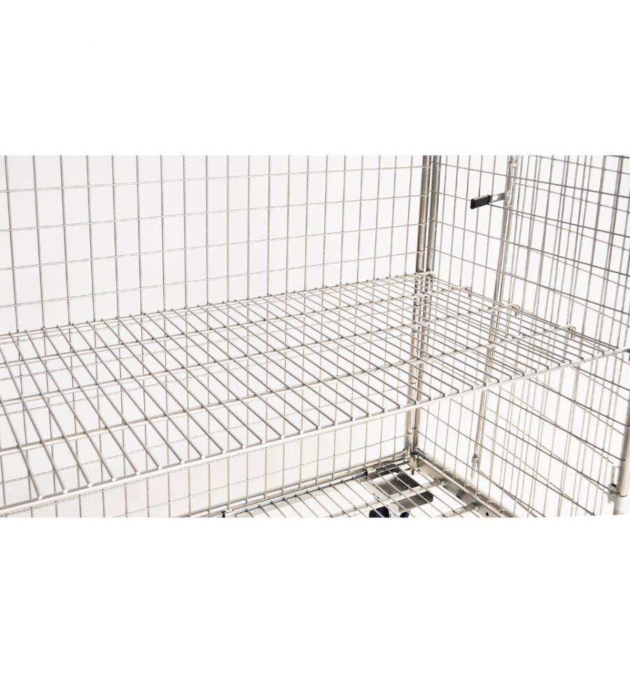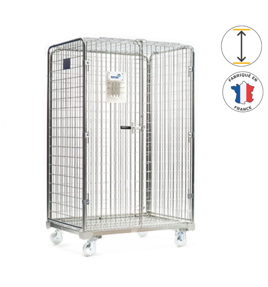 Ce chariot de manutention est doté de 4 côtés et d'un toit. Le tout refermable par cadenas.