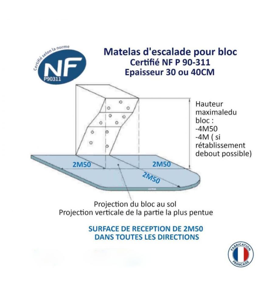 Découvrez notre matelas d'escalade pour pans et blocs d'escalade. 5 dimensions standards sont disponibles et il fait 40 cm d'épaisseur.