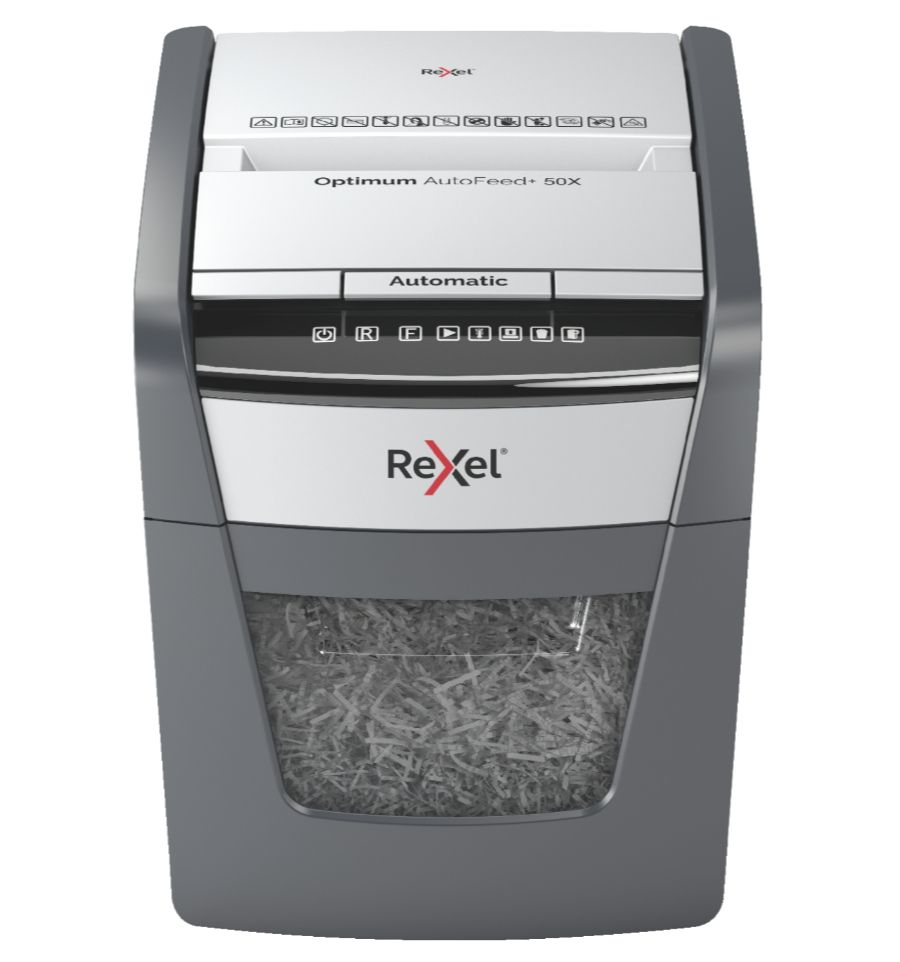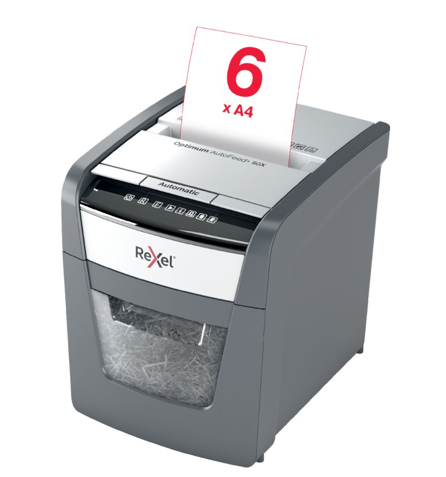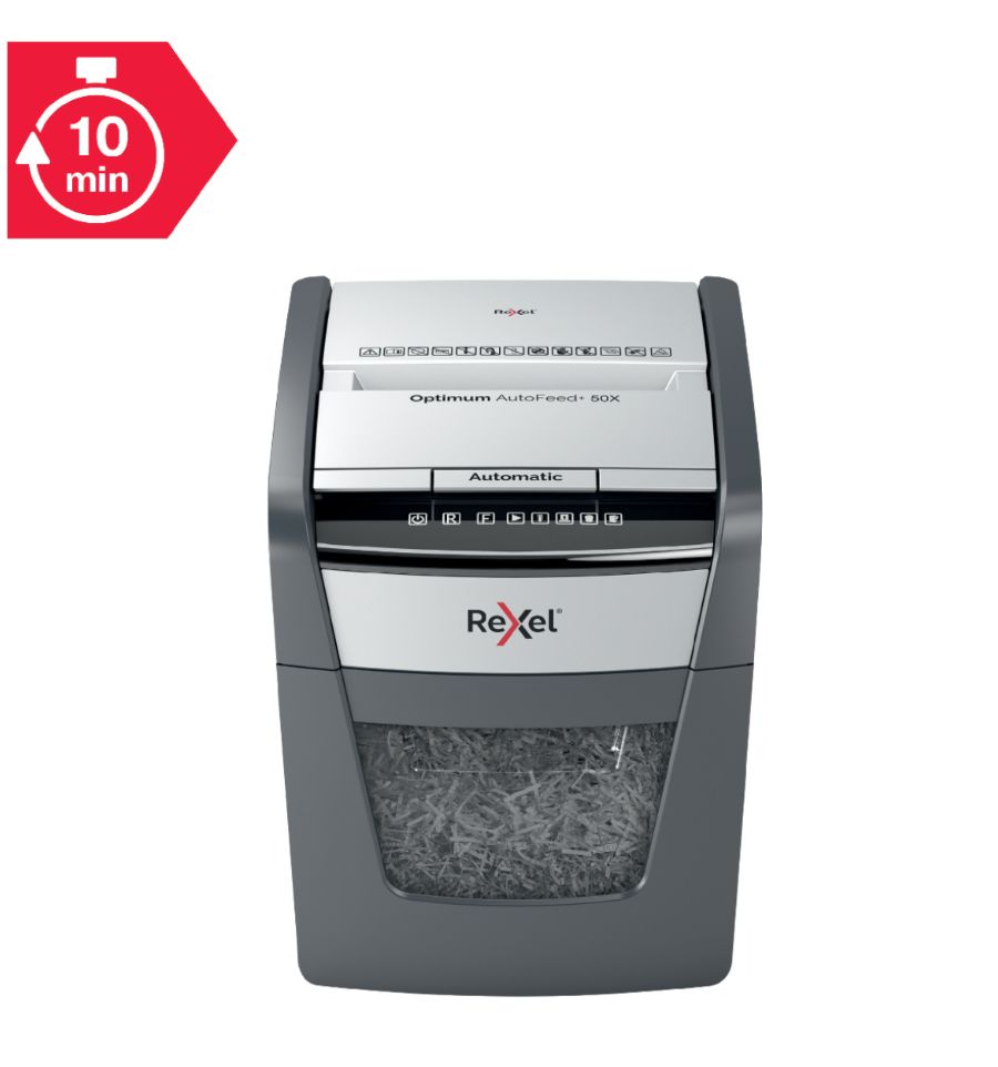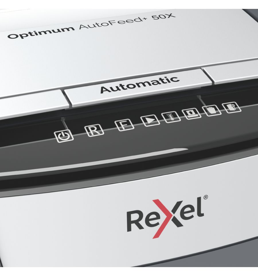 Destructeur de documents Rexel Optimum Autofeed+ 50X pour professionnel avec coupe croisée pour une destruction en particules 4 x 28 mm et un niveau de sécurité P-4. Corbeille amovible de 20L. Conçu pour les petits bureaux de 1 à 3 personnes, utilisable en continu pendant 10 minutes.