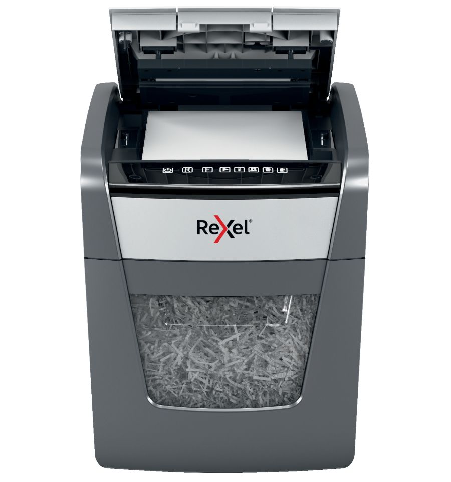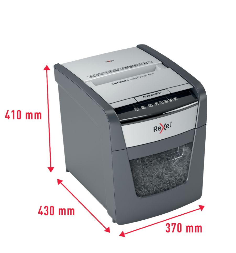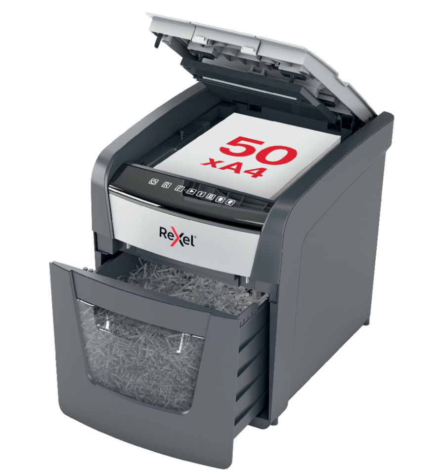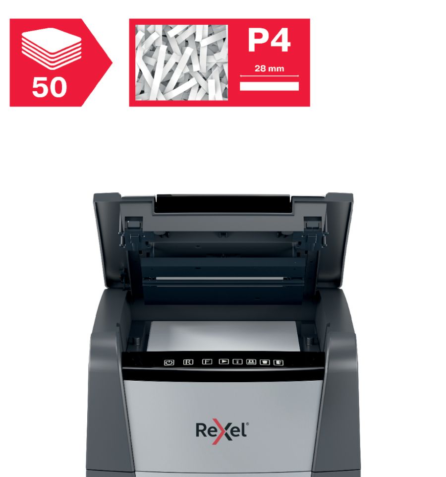 Destructeur de documents Rexel Optimum Autofeed+ 50X pour professionnel avec coupe croisée pour une destruction en particules 4 x 28 mm et un niveau de sécurité P-4. Corbeille amovible de 20L. Conçu pour les petits bureaux de 1 à 3 personnes, utilisable en continu pendant 10 minutes.