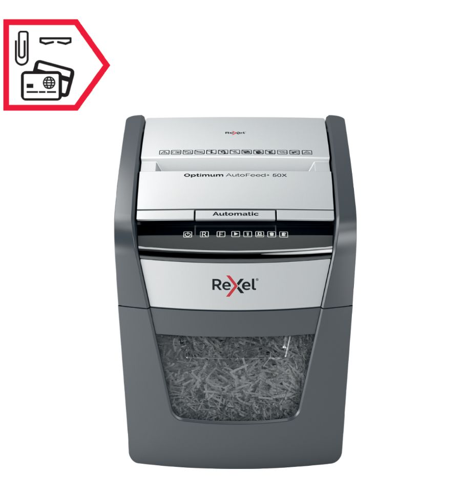 Destructeur de documents auto coupe croisée P4 50 feuilles 20 L Rexel Optimum AutoFeed+ 50X
